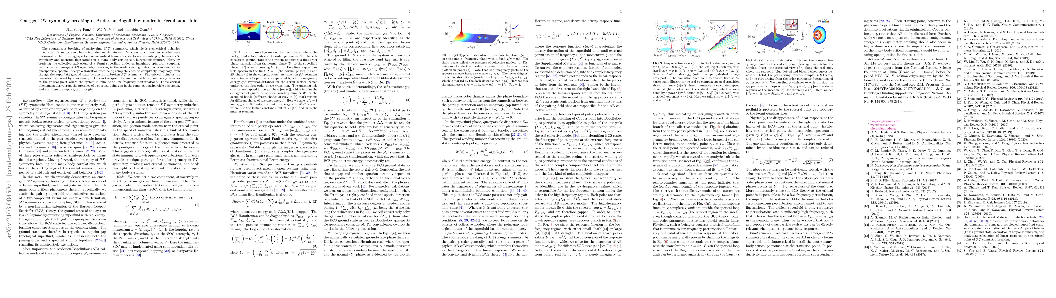 The spontaneous breaking of parity-time ($\mathcal{PT}$) symmetry, which yields rich critical behavior in non-Hermitian systems, has stimulated much interest. Whereas most previous studies were performed within the single-particle or mean-field framework, exploring the interplay between $\mathcal{PT}$ symmetry and quantum fluctuations in a many-body setting is a burgeoning frontier. Here, by studying the collective excitations of a Fermi superfluid under an imaginary spin-orbit coupling, we uncover an emergent $\mathcal{PT}$-symmetry breaking in the Anderson-Bogoliubov (AB) modes, whose quasiparticle spectra undergo a transition from being completely real to completely imaginary, even though the superfluid ground state retains an unbroken $\mathcal{PT}$ symmetry. The critical point of the transition is marked by a non-analytic kink in the speed of sound, as the latter completely vanishes at the critical point where the system is immune to low-frequency perturbations.These critical phenomena derive from the presence of a spectral point gap in the complex quasiparticle dispersion, and are therefore topological in origin.