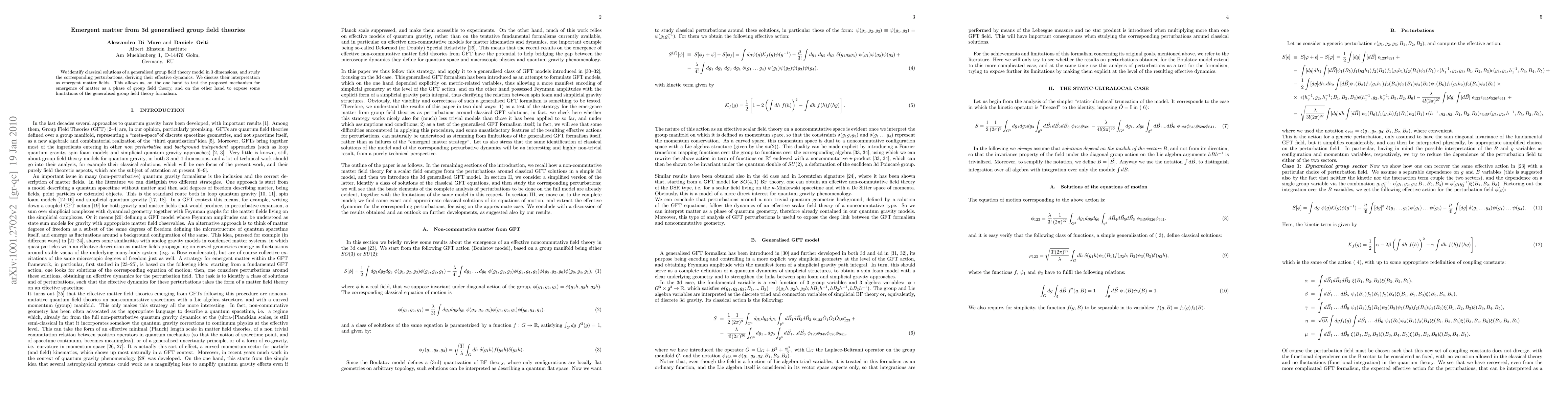 We identify classical solutions of a generalised group field theory model in 3 dimensions, and study the corresponding perturbations, deriving their effective dynamics. We discuss their interpretation as emergent matter fields. This allows us, on the one hand to test the proposed mechanism for emergence of matter as a phase of group field theory, and on the other hand to expose some limitations of the generalised group field theory formalism.