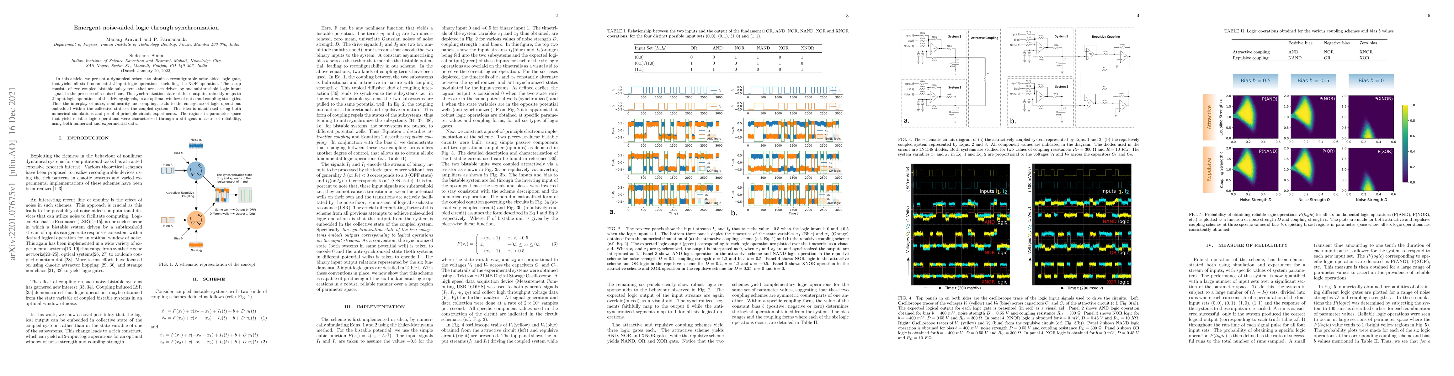 In this article, we present a dynamical scheme to obtain a reconfigurable noise-aided logic gate, that yields all six fundamental 2-input logic operations, including the XOR operation. The setup consists of two coupled bistable subsystems that are each driven by one subthreshold logic input signal, in the presence of a noise floor. The synchronization state of their outputs, robustly maps to 2-input logic operations of the driving signals, in an optimal window of noise and coupling strengths. Thus the interplay of noise, nonlinearity and coupling, leads to the emergence of logic operations embedded within the collective state of the coupled system. This idea is manifested using both numerical simulations and proof-of-principle circuit experiments. The regions in parameter space that yield reliable logic operations were characterized through a stringent measure of reliability, using both numerical and experimental data.