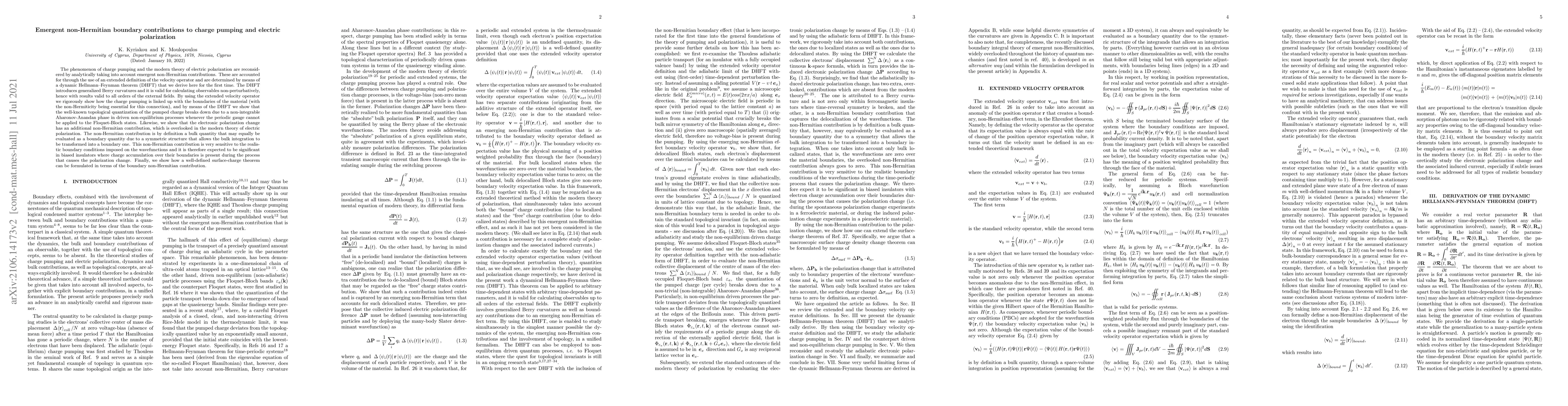 The phenomenon of charge pumping and the modern theory of electric polarization are reconsidered by analytically taking into account emergent non-Hermitian contributions. These are accounted for through the use of an extended definition of the velocity operator and are determined by means of a dynamic Hellmann-Feynman theorem (DHFT) that we derive here for the first time. The DHFT introduces generalized Berry curvatures and it is valid for calculating observables nonperturbatively, hence with results valid to all orders of the external fields. By using the extended velocity operator we rigorously show how the charge pumping is linked up with the boundaries of the material (with the non-Hermiticity being essential for this connection), and by means of the DHFT we show that the well-known topological quantization of the pumped charge breaks down due to a nonintegrable Aharonov-Anandan phase in driven non-equilibrium processes whenever the periodic gauge cannot be applied to the Floquet-Bloch states. Likewise, we show that the electronic polarization change has an additional non-Hermitian contribution, which is overlooked in the modern theory of electric polarization. The non-Hermitian contribution is by definition a bulk quantity that may equally be evaluated as a boundary quantity due to a symmetric structure that allows the bulk integration to be transformed into a boundary one. This non-Hermitian contribution is very sensitive to the realistic boundary conditions imposed on the wavefunctions and it is therefore expected to be significant in biased insulators where charge accumulation over their boundaries is present during the process that causes the polarization change. Finally, we show how a well-defined surface-charge theorem can be formulated in terms of the boundary non-Hermitian contribution.