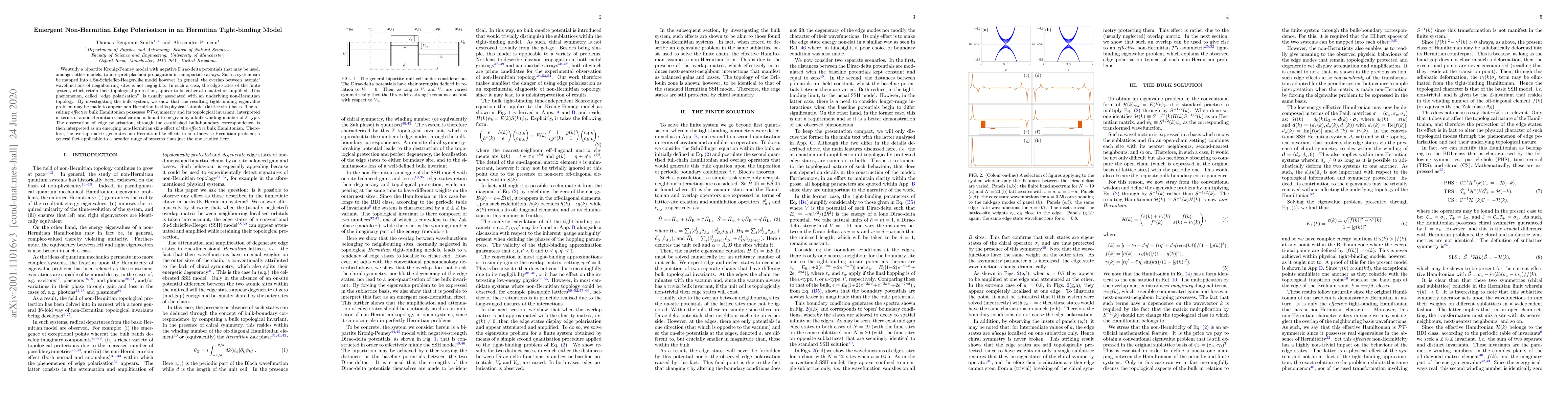 We study a bipartite Kronig-Penney model with negative Dirac-delta potentials that may be used, amongst other models, to interpret plasmon propagation in nanoparticle arrays. Such a system can be mapped into a Su-Schrieffer-Heeger-like model however, in general, the overlap between 'atomic' wavefunctions of neighbouring sites is not negligible. In such a case, the edge states of the finite system, which retain their topological protection, appear to be either attenuated or amplified. This phenomenon, called "edge polarisation", is usually associated with an underlying non-Hermitian topology. By investigating the bulk system, we show that the resulting tight-binding eigenvalue problem may be made to appear non-Hermitian in this physical 'atomic' (lattice-site) basis. The resulting {\it effective} bulk Hamiltonian possesses ${\cal PT}$-symmetry and its topological invariant, interpreted in terms of a non-Hermitian classification, is found to be given by a bulk winding number of $\mathbb{Z}$-type. The observation of edge polarisation, through the established bulk-boundary correspondence, is then interpreted as an emerging non-Hermitian skin-effect of the {\it effective} bulk Hamiltonian. Therefore, the overlap matrix generates non-Hermitian-like effects in an otherwise Hermitian problem; a general fact applicable to a broader range of systems than just the one studied here.