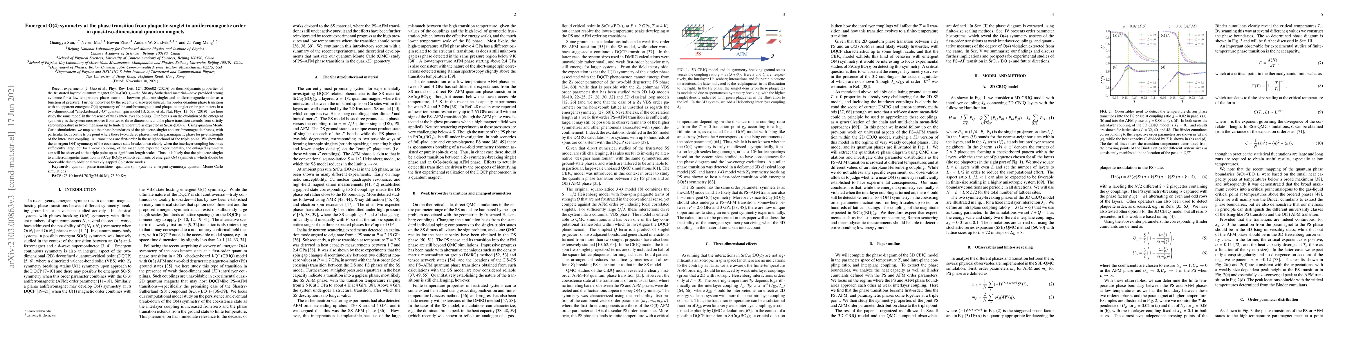 Recent experiments [J. Guo et al., Phys. Rev. Lett.124,206602 (2020)] on thermodynamic properties of the frustrated layered quantum magnet SrCu$_2$(BO$_3$)$_2$ -- the Shastry-Sutherland material -- have provided strong evidence for a low-temperature phase transition between plaquette-singlet and antiferromagnetic order as a function of pressure. Further motivated by the recently discovered unusual first-order quantum phase transition with an apparent emergent O(4) symmetry of the antiferromagnetic and plaquette-singlet order parameters in a two-dimensional "checkerboard J-Q" quantum spin model [B. Zhao et al., Nat. Phys. 15, 678 (2019)], we here study the same model in the presence of weak inter-layer couplings. Our focus is on the evolution of the emergent symmetry as the system crosses over from two to three dimensions and the phase transition extends from strictly zero temperature in two dimensions up to finite temperature as expected in SrCu$_2$(BO$_3$)$_2$. Using quantum Monte Carlo simulations, we map out the phase boundaries of the plaquette-singlet and antiferromagnetic phases, with particular focus on the triple point where these two order phases meet the paramagnetic phase for given strength of the inter-layer coupling. All transitions are first-order in the neighborhood of the triple points. We show that the emergent O(4) symmetry of the coexistence state breaks down clearly when the interlayer coupling becomes sufficiently large, but for a weak coupling, of the magnitude expected experimentally, the enlarged symmetry can still be observed at the triple point up to significant length scales. Thus, it is likely that the plaquette-singlet to antiferromagnetic transition in SrCu$_2$(BO$_3$)$_2$ exhibits remnants of emergent O(4) symmetry, which should be observable due to additional weakly gapped Goldstone modes.