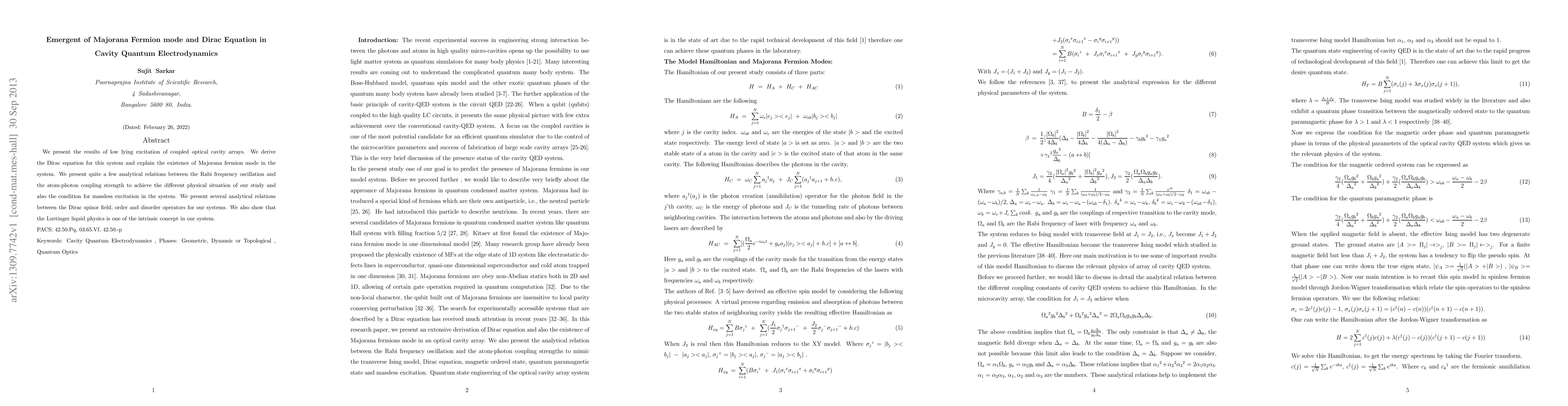This paper explores the low-lying excitations in coupled optical cavity arrays, deriving the Dirac equation and demonstrating the existence of Majorana fermion modes. It establishes analytical connections between the Rabi frequency and atom-photon coupling, and highlights Luttinger liquid physics as an intrinsic feature.