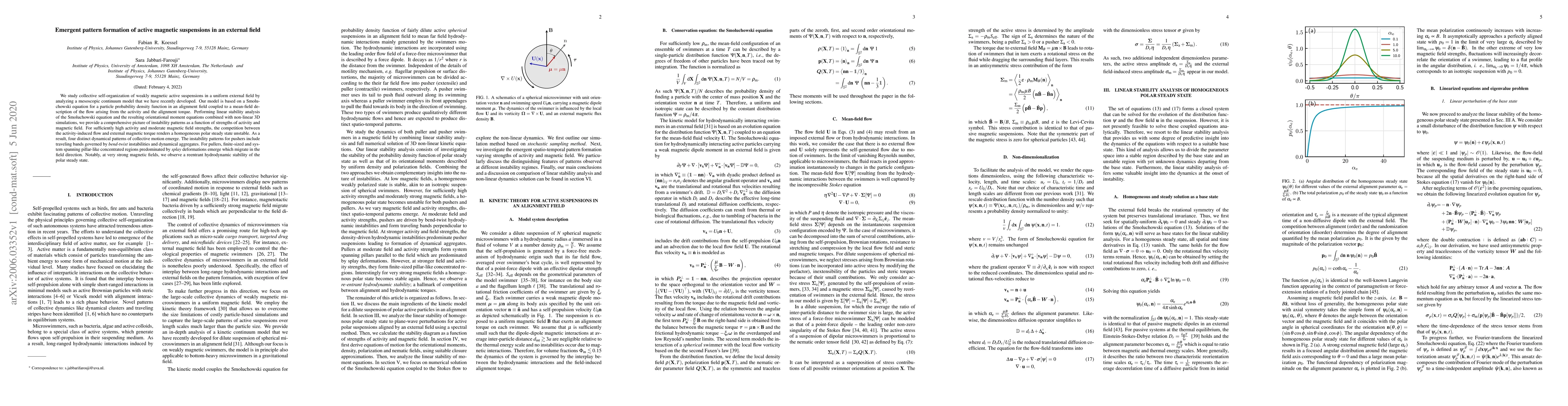 This paper investigates the self-organization of active magnetic suspensions in an external field, revealing emergent patterns through a mesoscopic continuum model. High activity and moderate magnetic fields destabilize the polar steady state, leading to four distinct dynamical patterns, including traveling bands and pillar-like regions, while strong magnetic fields restore stability.