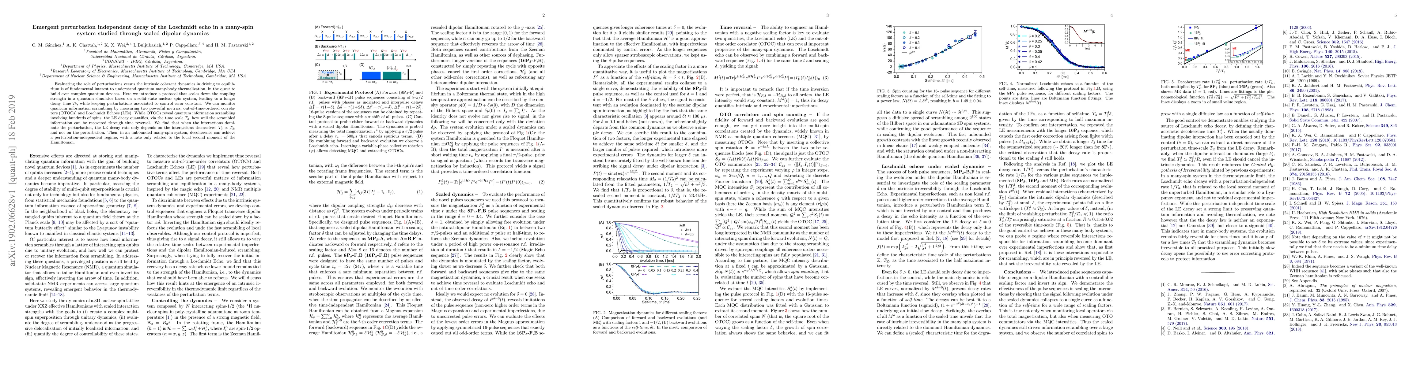Evaluating the role of perturbations versus the intrinsic coherent dynamics in driving to equilibrium is of fundamental interest to understand quantum many-body thermalization, in the quest to build ever complex quantum devices. Here we introduce a protocol that scales down the coupling strength in a quantum simulator based on a solid-state nuclear spin system, leading to a longer decay time T2, while keeping perturbations associated to control error constant. We can monitor quantum information scrambling by measuring two powerful metrics, out-of-time-ordered correlators (OTOCs) and Loschmidt Echoes (LEs). While OTOCs reveal quantum information scrambling involving hundreds of spins, the LE decay quantifies, via the time scale T3, how well the scrambled information can be recovered through time reversal. We find that when the interactions dominate the perturbation, the LE decay rate only depends on the interactions themselves, T3 ~ T2, and not on the perturbation. Then, in an unbounded many-spin system, decoherence can achieve a perturbation-independent regime, with a rate only related to the local second moment of the Hamiltonian.