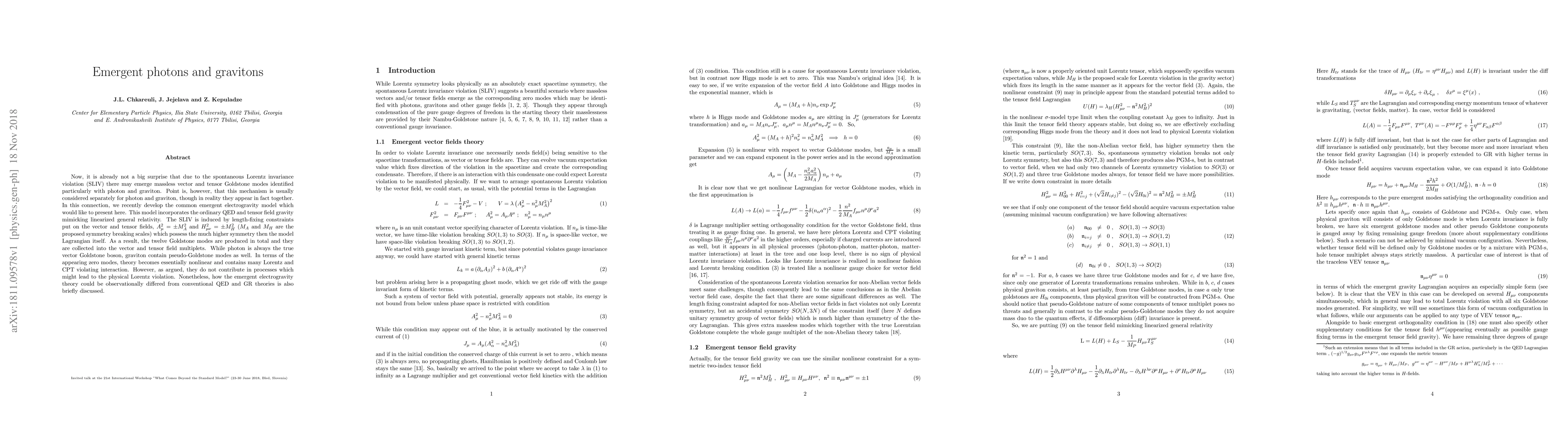 Now, it is already not a big surprise that due to the spontaneous Lorentz invariance violation (SLIV) there may emerge massless vector and tensor Goldstone modes identified particularly with photon and graviton. Point is, however, that this mechanism is usually considered separately for photon and graviton, though in reality they appear in fact together. In this connection, we recently develop the common emergent electrogravity model which would like to present here. This model incorporates the ordinary QED and tensor field gravity mimicking linearized general relativity. The SLIV is induced by length-fixing constraints put on the vector and tensor fields, $A_{\mu }^{2}=\pm M_{A}^{2}$ and $H_{\mu \nu }^{2}=\pm M_{H}^{2}$ ($M_{A}$ and $M_{H}$ are the proposed symmetry breaking scales) which possess the much higher symmetry then the model Lagrangian itself. As a result, the twelve Goldstone modes are produced in total and they are collected into the vector and tensor field multiplets. While photon is always the true vector Goldstone boson, graviton contain pseudo-Goldstone modes as well. In terms of the appearing zero modes, theory becomes essentially nonlinear and contains many Lorentz and CPT violating interaction. However, as argued, they do not contribute in processes which might lead to the physical Lorentz violation. Nonetheless, how the emergent electrogravity theory could be observationally differed from conventional QED and GR theories is also briefly discussed.