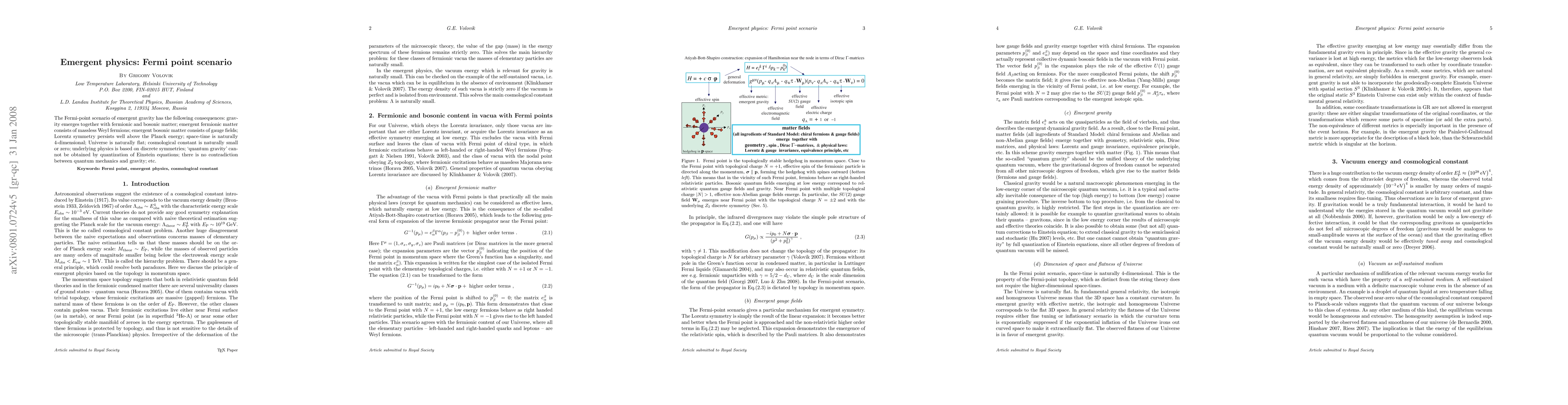 The Fermi-point scenario of emergent gravity has the following consequences: gravity emerges together with fermionic and bosonic matter; emergent fermionic matter consists of massless Weyl fermions; emergent bosonic matter consists of gauge fields; Lorentz symmetry persists well above the Planck energy; space-time is naturally 4-dimensional; Universe is naturally flat; cosmological constant is naturally small or zero; underlying physics is based on discrete symmetries; `quantum gravity' cannot be obtained by quantization of Einstein equations; there is no contradiction between quantum mechanics and gravity; etc.