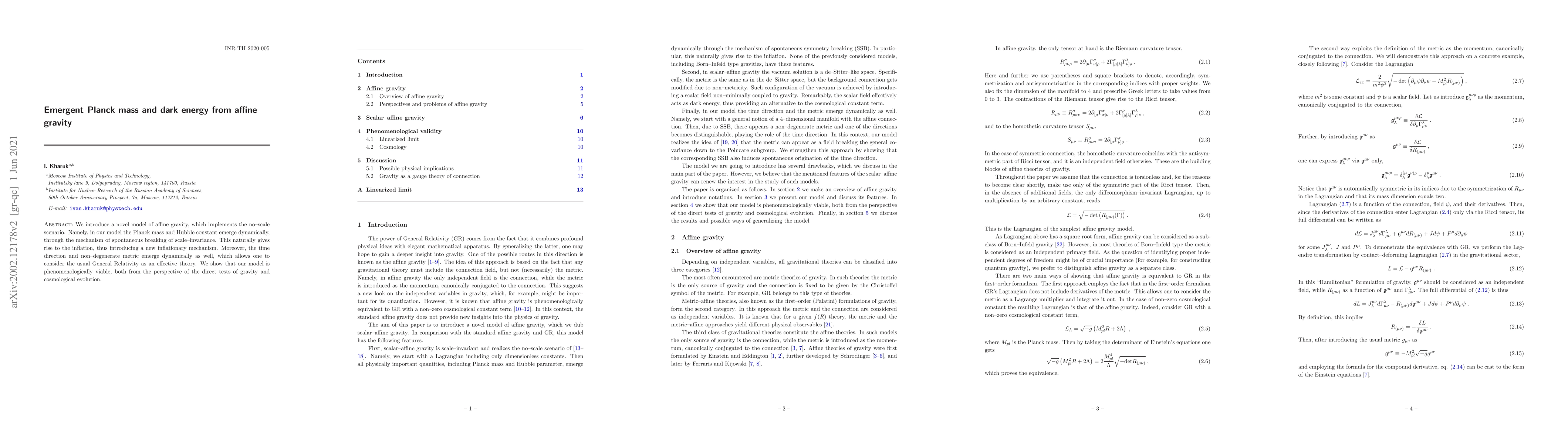 The research presents a new affine gravity model where Planck mass and Hubble constant emerge via spontaneous scale-invariance breaking, dynamically generating time direction and non-degenerate metric. This model supports inflation and cosmological evolution, offering a phenomenologically viable framework for understanding the Universe's origin.