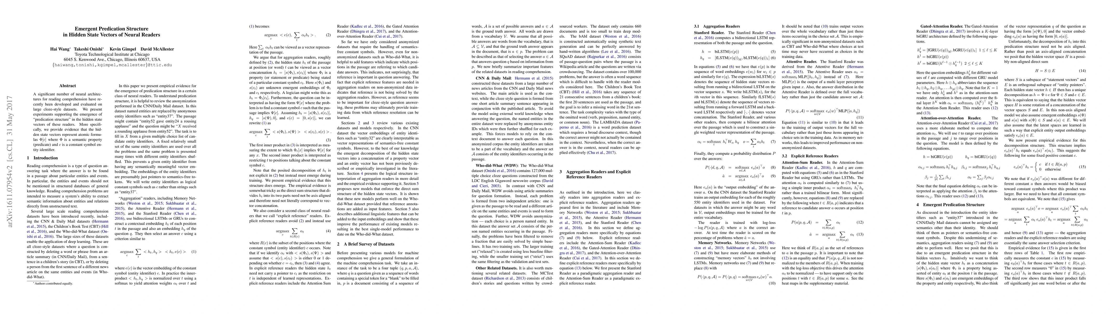 A significant number of neural architectures for reading comprehension have recently been developed and evaluated on large cloze-style datasets. We present experiments supporting the emergence of "predication structure" in the hidden state vectors of these readers. More specifically, we provide evidence that the hidden state vectors represent atomic formulas $\Phi[c]$ where $\Phi$ is a semantic property (predicate) and $c$ is a constant symbol entity identifier.