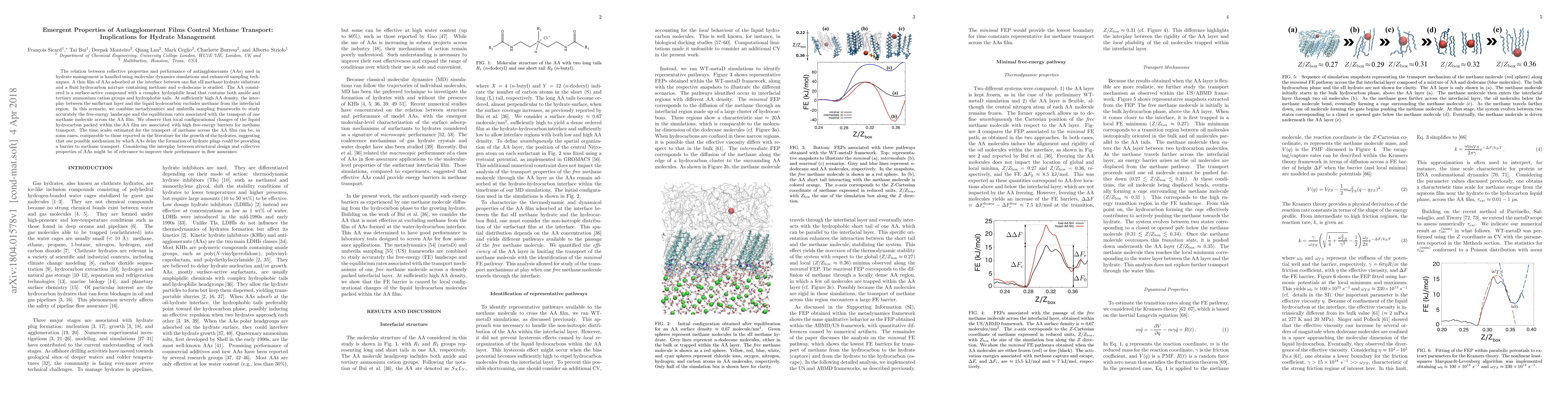 The relation between collective properties and performance of antiagglomerants (AAs) used in hydrate management is handled using molecular dynamics simulations and enhanced sampling techniques. A thin film of AAs adsorbed at the interface between one flat sII methane hydrate substrate and a fluid hydrocarbon mixture containing methane and n-dodecane is studied. The AA considered is a surface-active compound with a complex hydrophilic head that contains both amide and tertiary ammonium cation groups and hydrophobic tails. At sufficiently high AA density, the interplay between the surfactant layer and the liquid hydrocarbon excludes methane from the interfacial region. In this scenario, we combine metadynamics and umbrella sampling frameworks to study accurately the free-energy landscape and the equilibrium rates associated with the transport of one methane molecule across the AA film. We observe that local configurational changes of the liquid hydrocarbon packed within the AA film are associated with high free-energy barriers for methane transport. The time scales estimated for the transport of methane across the AA film can be, in some cases, comparable to those reported in the literature for the growth of the hydrates, suggesting that one possible mechanism by which AAs delay the formation of hydrate plugs could be providing a barrier to methane transport. Considering the interplay between structural design and collective properties of AAs might be of relevance to improve their performance in flow assurance.