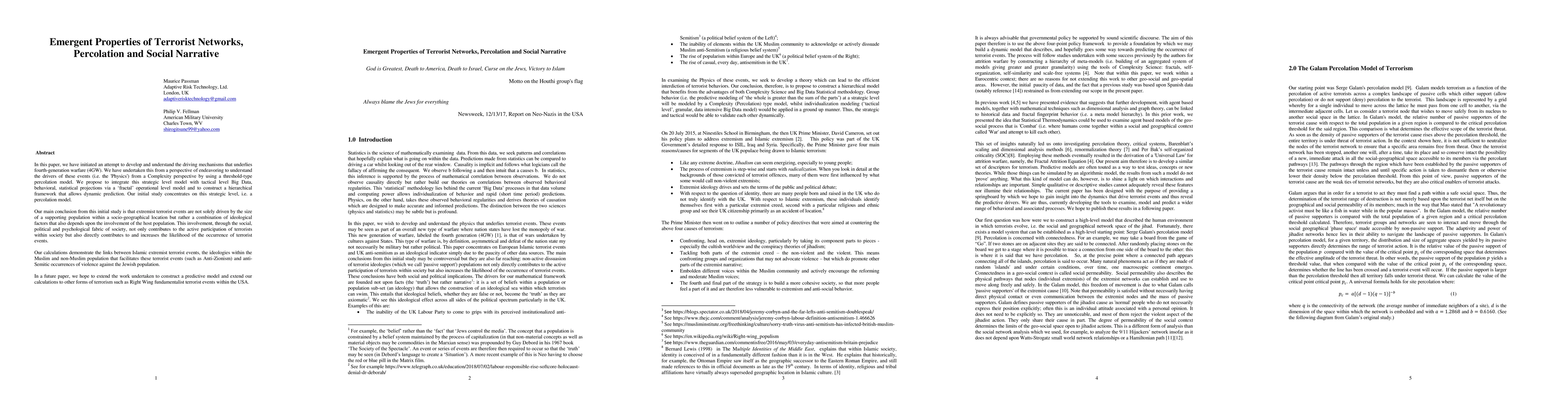 In this paper, we have initiated an attempt to develop and understand the driving mechanisms that underlie fourth-generation warfare. We have undertaken this from a perspective of endeavoring to understand the drivers of these events from a Complexity perspective by using a threshold-type percolation model. We propose to integrate this strategic level model with tactical level Big Data, behavioral, statistical projections via a fractal operational level model and to construct a hierarchical framework that allows dynamic prediction. Our initial study concentrates on this strategic level, i.e. a percolation model. Our main conclusion from this initial study is that extremist terrorist events are not solely driven by the size of a supporting population within a socio-geographical location but rather a combination of ideological factors that also depends upon the involvement of the host population. This involvement, through the social, political and psychological fabric of society, not only contributes to the active participation of terrorists within society but also directly contributes to and increases the likelihood of the occurrence of terrorist events. Our calculations demonstrate the links between Islamic extremist terrorist events, the ideologies within the Muslim and non-Muslim population that facilitates these terrorist events (such as Anti-Zionism) and anti-Semitic occurrences of violence against the Jewish population. In a future paper, we hope to extend the work undertaken to construct a predictive model and extend our calculations to other forms of terrorism such as Right Wing fundamentalist terrorist events within the USA.