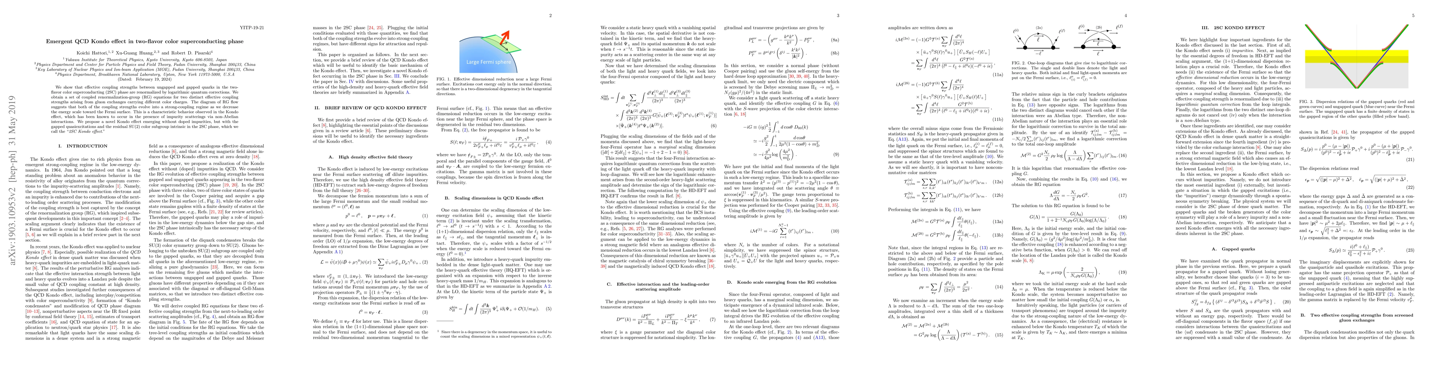 We show that effective coupling strengths between ungapped and gapped quarks in the two-flavor color superconducting (2SC) phase are renormalized by logarithmic quantum corrections. We obtain a set of coupled renormalization-group (RG) equations for two distinct effective coupling strengths arising from gluon exchanges carrying different color charges. The diagram of RG flow suggests that both of the coupling strengths evolve into a strong-coupling regime as we decrease the energy scale toward the Fermi surface. This is a characteristic behavior observed in the Kondo effect, which has been known to occur in the presence of impurity scatterings via non-Abelian interactions. We propose a novel Kondo effect emerging without doped impurities, but with the gapped quasiexcitations and the residual SU(2) color subgroup intrinsic in the 2SC phase, which we call the 2SC Kondo effect.