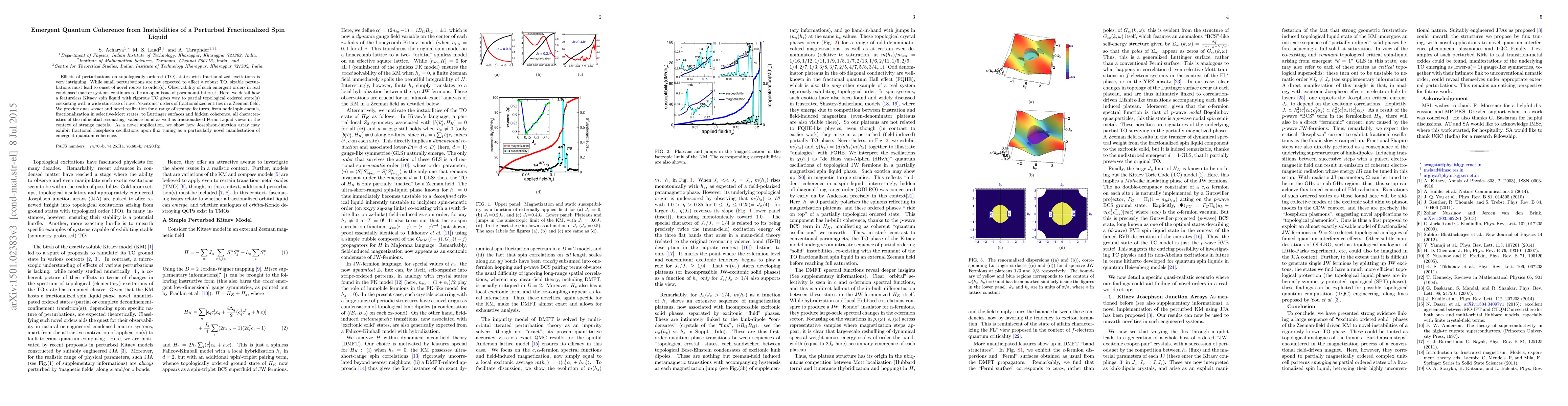 This paper explores how perturbations in a topologically ordered fractionalized spin liquid lead to emergent quantum coherence, resulting in a variety of novel orders, including nodal spin-metals and fractional Josephson oscillations in Josephson-junction arrays. The study highlights the transition from a featureless Kitaev spin liquid to a coexistence of partial topological orders and excitonic orders under a Zeeman field.