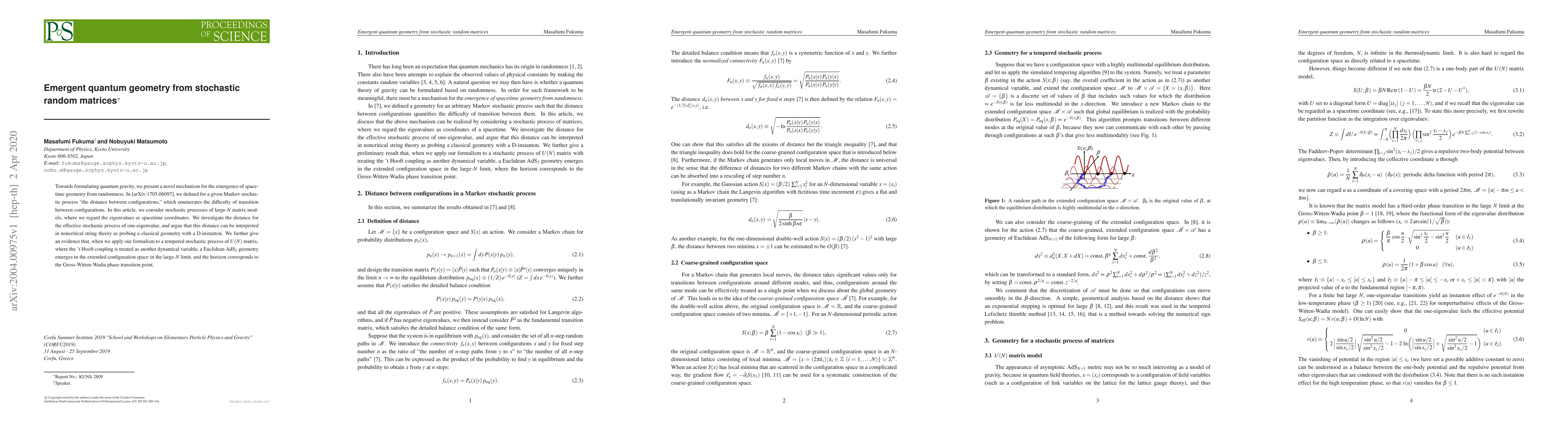 Towards formulating quantum gravity, we present a novel mechanism for the emergence of spacetime geometry from randomness. In [arXiv:1705.06097], we defined for a given Markov stochastic process "the distance between configurations," which enumerates the difficulty of transition between configurations. In this article, we consider stochastic processes of large-$N$ matrix models, where we regard the eigenvalues as spacetime coordinates. We investigate the distance for the effective stochastic process of one-eigenvalue, and argue that this distance can be interpreted in noncritical string theory as probing a classical geometry with a D-instanton. We further give an evidence that, when we apply our formalism to a tempered stochastic process of $U(N)$ matrix, where the 't Hooft coupling is treated as another dynamical variable, a Euclidean AdS$_2$ geometry emerges in the extended configuration space in the large-$N$ limit, and the horizon corresponds to the Gross-Witten-Wadia phase transition point.