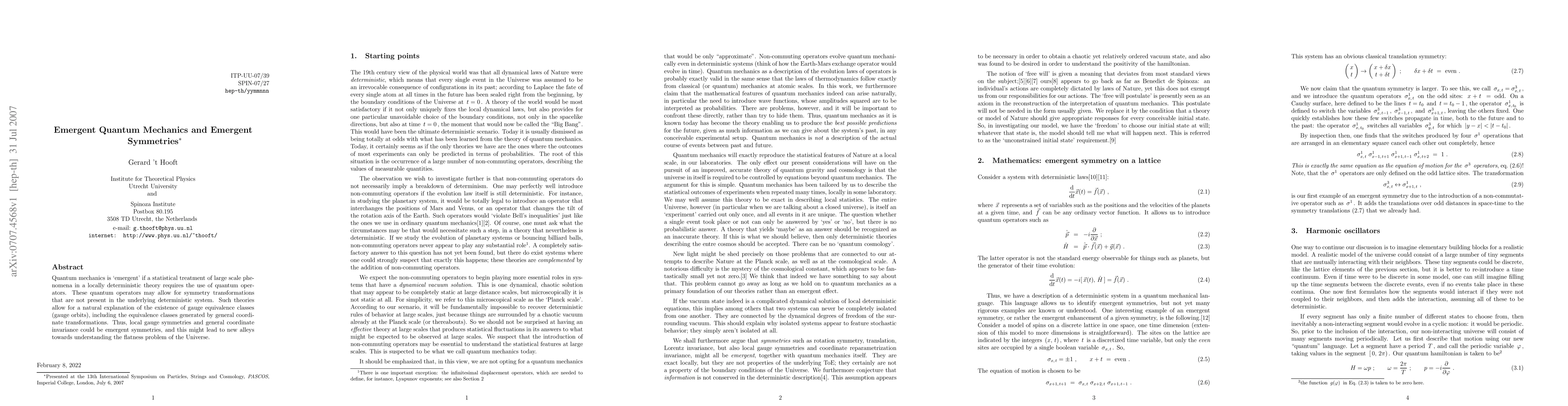 This paper explores the concept of emergent quantum mechanics, where quantum operators arise from statistical treatments of large-scale phenomena in a locally deterministic framework, potentially giving rise to new symmetries like gauge equivalence and general coordinate invariance. This emergent symmetry perspective may offer novel insights into the flatness problem of the Universe.