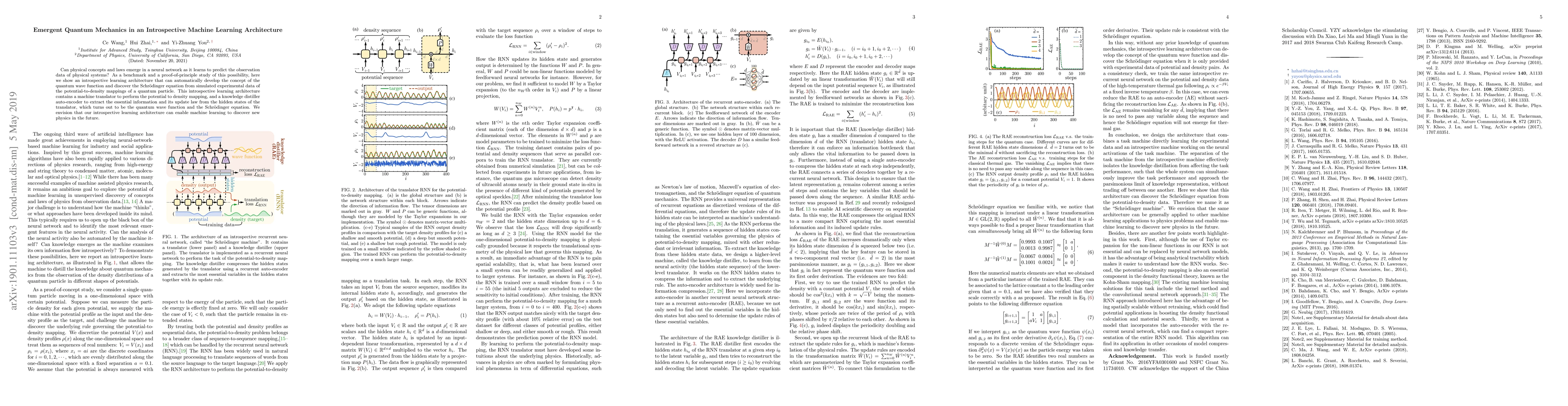 Can physical concepts and laws emerge in a neural network as it learns to predict the observation data of physical systems? As a benchmark and a proof-of-principle study of this possibility, here we show an introspective learning architecture that can automatically develop the concept of the quantum wave function and discover the Schr\"odinger equation from simulated experimental data of the potential-to-density mappings of a quantum particle. This introspective learning architecture contains a machine translator to perform the potential to density mapping, and a knowledge distiller auto-encoder to extract the essential information and its update law from the hidden states of the translator, which turns out to be the quantum wave function and the Schr\"odinger equation. We envision that our introspective learning architecture can enable machine learning to discover new physics in the future.