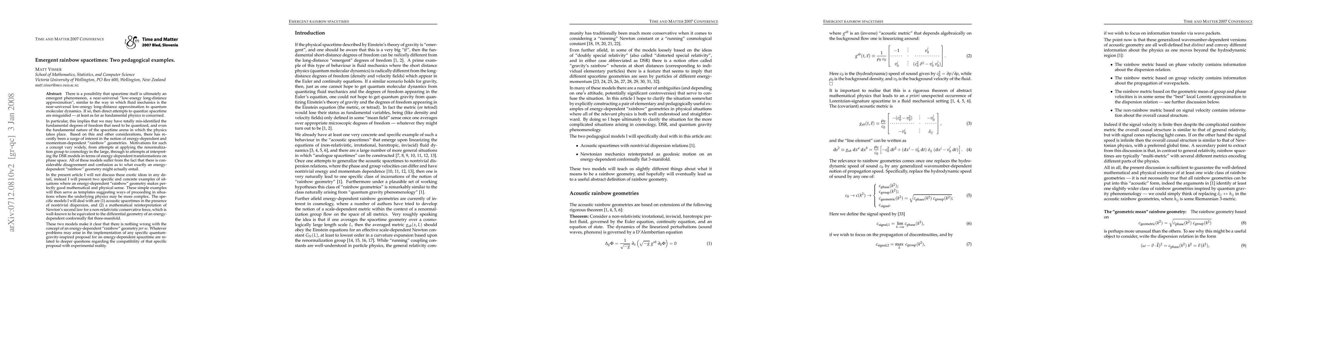This paper explores the concept of emergent "rainbow" spacetimes through two pedagogical examples: acoustic spacetimes with nontrivial dispersion and a reinterpretation of Newton's second law in an energy-dependent conformally flat three-manifold. These models demonstrate the mathematical and physical validity of energy-dependent spacetimes, suggesting they can serve as templates for more complex quantum-gravity scenarios.