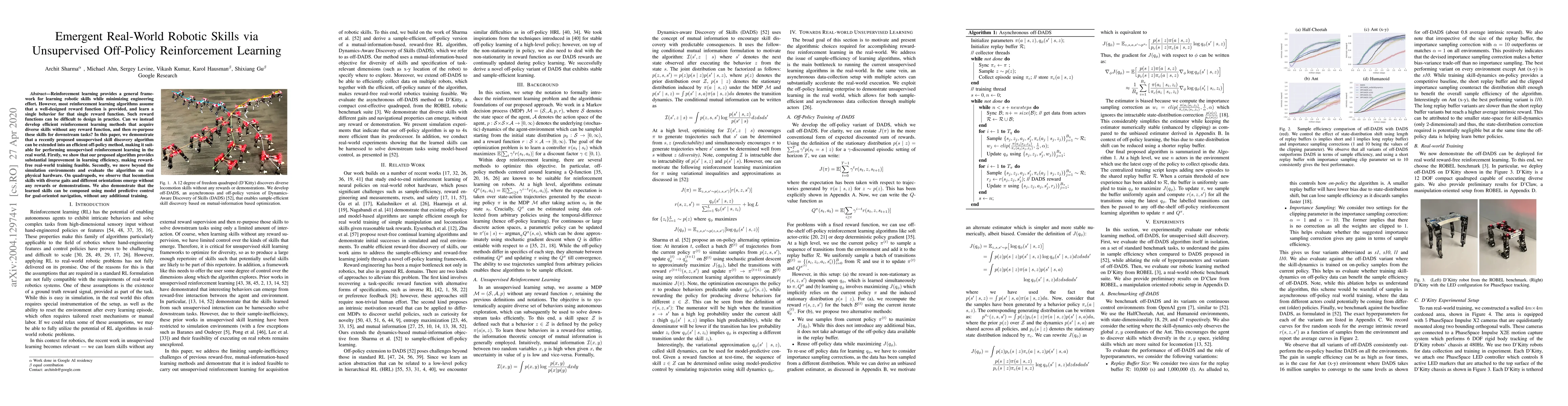 This paper proposes an unsupervised off-policy reinforcement learning method to develop diverse robotic skills in real-world environments without predefined reward functions. The algorithm shows improved learning efficiency and enables the emergence of various locomotion skills on quadruped robots, which can then be composed for navigation tasks.