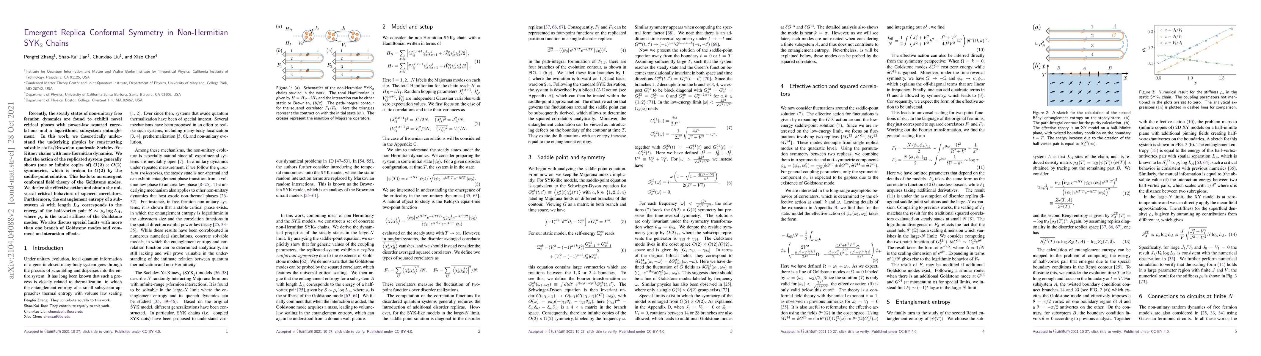 This paper explores emergent replica conformal symmetry in non-Hermitian SYK$_2$ chains, revealing novel critical phases with power-law squared correlations and logarithmic entanglement. The study constructs solvable quadratic Sachdev-Ye-Kitaev models with non-Hermitian dynamics, uncovering an emergent conformal field theory of Goldstone modes and deriving universal critical behaviors and entanglement entropy scaling laws.