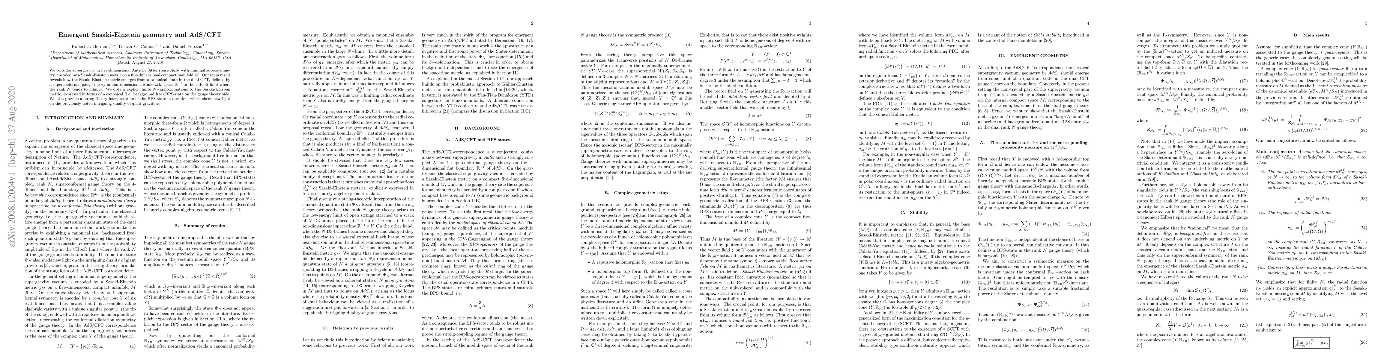 We consider supergravity in five-dimensional Anti-De Sitter space $AdS_{5}$ with minimal supersymmetry, encoded by a Sasaki-Einstein metric on a five-dimensional compact manifold $M$. Our main result reveals how the Sasaki-Einstein metric emerges from a canonical state in the dual CFT, defined by a superconformal gauge theory in four dimensional Minkowski space $\mathbb{R}^{3,1}$in the t'Hooft limit where the rank $N$ tends to infinity. We obtain explicit finite $N-$approximations to the Sasaki-Einstein metric, expressed in terms of a canonical (i.e. background free) BPS-state on the gauge theory side. We also provide a string theory interpretation of the BPS-state in question, which sheds new light on the previously noted intriguing duality of giant gravitons.