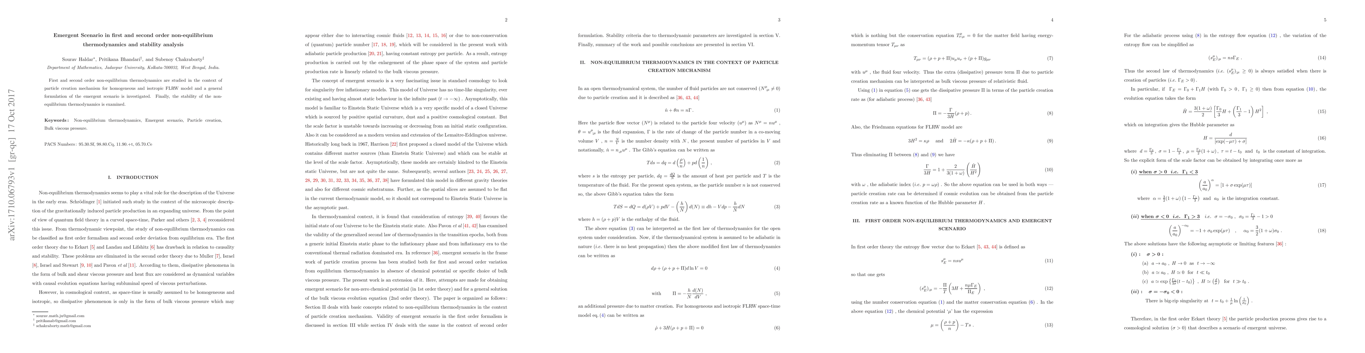 First and second order non-equilibrium thermodynamics are studied in the context of particle creation mechanism for homogeneous and isotropic FLRW model and a general formulation of the emergent scenario is investigated. Finally, the stability of the non-equilibrium thermodynamics is examined.