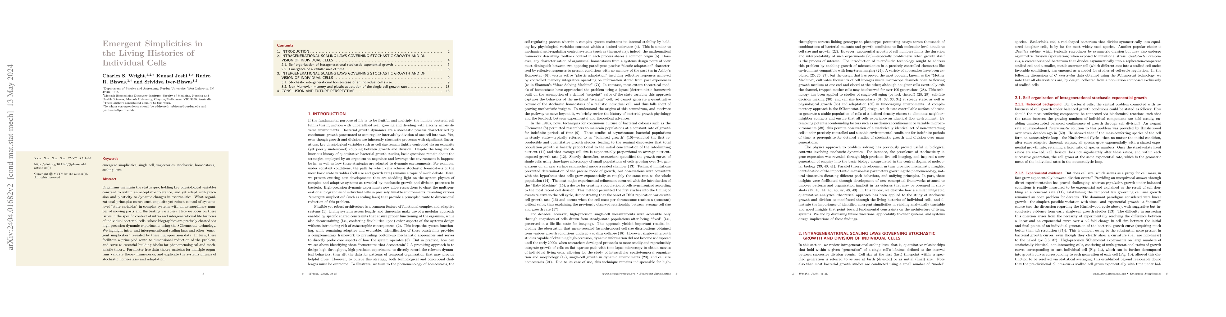 This research explores how bacterial cells maintain stability and adapt to changes using high-precision experiments. It reveals emergent scaling laws and simplicities in the life histories of individual cells, providing a foundational framework for understanding complex systems and validating theories of stochastic homeostasis and adaptation.