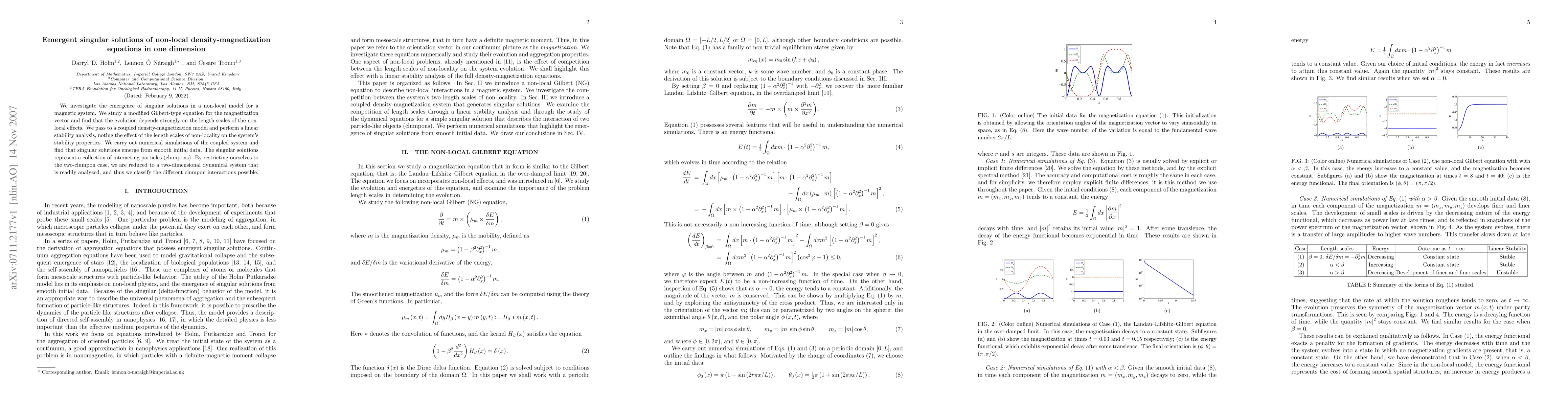 We investigate the emergence of singular solutions in a non-local model for a magnetic system. We study a modified Gilbert-type equation for the magnetization vector and find that the evolution depends strongly on the length scales of the non-local effects. We pass to a coupled density-magnetization model and perform a linear stability analysis, noting the effect of the length scales of non-locality on the system's stability properties. We carry out numerical simulations of the coupled system and find that singular solutions emerge from smooth initial data. The singular solutions represent a collection of interacting particles (clumpons). By restricting ourselves to the two-clumpon case, we are reduced to a two-dimensional dynamical system that is readily analyzed, and thus we classify the different clumpon interactions possible.