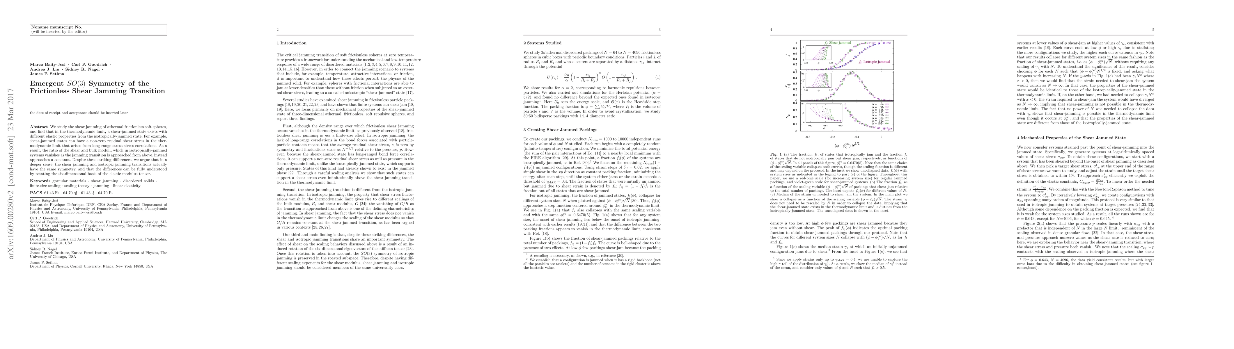 This paper investigates the frictionless shear jamming of athermal soft spheres, revealing that the shear-jammed state exhibits distinct elastic properties compared to the isotropically-jammed state, including non-zero residual shear stress. Despite these differences, the study argues that both jamming transitions share an emergent SO(3) symmetry, understood through a rotation of the elastic modulus tensor's basis.