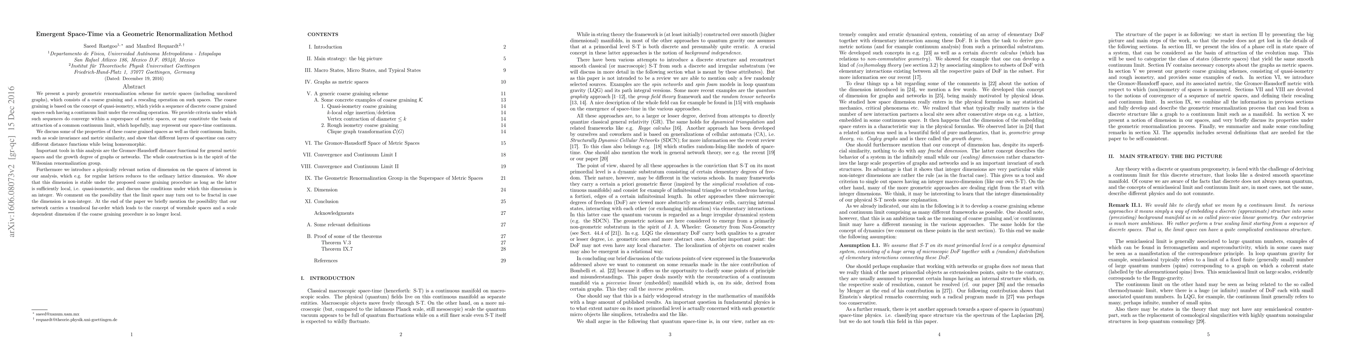 We present a purely geometric renormalization scheme for metric spaces (including uncolored graphs), which consists of a coarse graining and a rescaling operation on such spaces. The coarse graining is based on the concept of quasi-isometry, which yields a sequence of discrete coarse grained spaces each having a continuum limit under the rescaling operation. We provide criteria under which such sequences do converge within a superspace of metric spaces, or may constitute the basin of attraction of a common continuum limit, which hopefully, may represent our space-time continuum. We discuss some of the properties of these coarse grained spaces as well as their continuum limits, such as scale invariance and metric similarity, and show that different layers of spacetime can carry different distance functions while being homeomorphic. Important tools in this analysis are the Gromov-Hausdorff distance functional for general metric spaces and the growth degree of graphs or networks. The whole construction is in the spirit of the Wilsonian renormalization group. Furthermore we introduce a physically relevant notion of dimension on the spaces of interest in our analysis, which e.g. for regular lattices reduces to the ordinary lattice dimension. We show that this dimension is stable under the proposed coarse graining procedure as long as the latter is sufficiently local, i.e. quasi-isometric, and discuss the conditions under which this dimension is an integer. We comment on the possibility that the limit space may turn out to be fractal in case the dimension is non-integer. At the end of the paper we briefly mention the possibility that our network carries a translocal far-order which leads to the concept of wormhole spaces and a scale dependent dimension if the coarse graining procedure is no longer local.