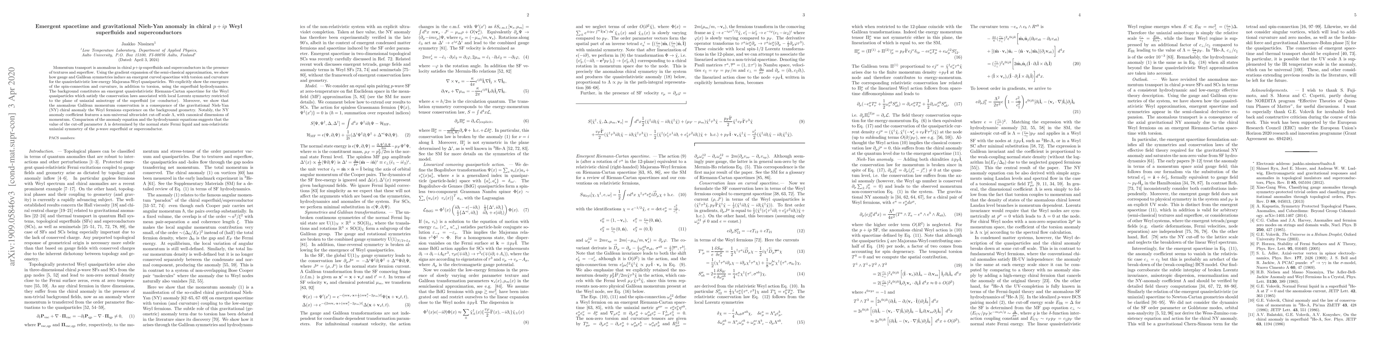 Momentum transport is anomalous in chiral $p+ip$ superfluids and superconductors in the presence of textures and superflow. Using the gradient expansion of the semi-classical approximation, we show how gauge and Galilean symmetries induce an emergent curved spacetime with torsion and curvature for the quasirelativistic low-energy Majorana-Weyl quasiparticles. We explicitly show the emergence of the spin-connection and curvature, in addition to torsion, using the superfluid hydrodynamics. The background constitutes an emergent quasirelativistic Riemann-Cartan spacetime for the Weyl quasiparticles and they satisfy the conservation laws associated with local Lorentz symmetry, restricted to the plane of uniaxial anisotropy of the superfluid (or -conductor). Moreover, we show that the anomalous Galilean momentum conservation is a consequence of the gravitational Nieh-Yan (NY) chiral anomaly the Weyl fermions experience on the background geometry. Notably, the NY anomaly coefficient features a non-universal ultraviolet cut-off scale $\Lambda$, with canonical dimensions of momentum. Comparison of the anomaly equation and the hydrodynamic equations suggests that the value of the cut-off parameter $\Lambda$ is determined by the normal state Fermi liquid and non-relativistic uniaxial symmetry of the $p$-wave superfluid or superconductor.