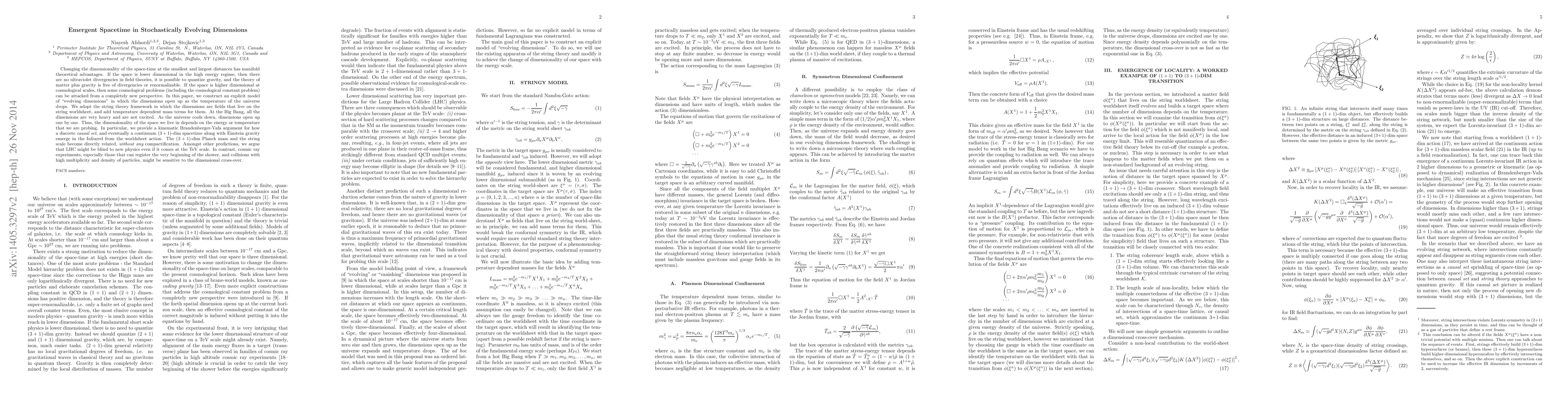 Changing the dimensionality of the space-time at the smallest and largest distances has manifold theoretical advantages. If the space is lower dimensional in the high energy regime, then there are no ultraviolet divergencies in field theories, it is possible to quantize gravity, and the theory of matter plus gravity is free of divergencies or renormalizable. If the space is higher dimensional at cosmological scales, then some cosmological problems (including the cosmological constant problem) can be attacked from a completely new perspective. In this paper, we construct an explicit model of "evolving dimensions" in which the dimensions open up as the temperature of the universe drops. We adopt the string theory framework in which the dimensions are fields that live on the string worldsheet, and add temperature dependent mass terms for them. At the Big Bang, all the dimensions are very heavy and are not excited. As the universe cools down, dimensions open up one by one. Thus, the dimensionality of the space we live in depends on the energy or temperature that we are probing. In particular, we provide a kinematic Brandenberger-Vafa argument for how a discrete {\it causal set}, and eventually a continuum $(3+1)$-dim spacetime along with Einstein gravity emerge in the Infrared from the worldsheet action. The $(3+1)$-dim Planck mass and the string scale become directly related, {\it without any} compactification. Amongst other predictions, we argue that LHC might be blind to new physics even if it comes at the TeV scale. In contrast, cosmic ray experiments, especially those that can register the very beginning of the shower, and collisions with high multiplicity and density of particles, might be sensitive to the dimensional cross-over.