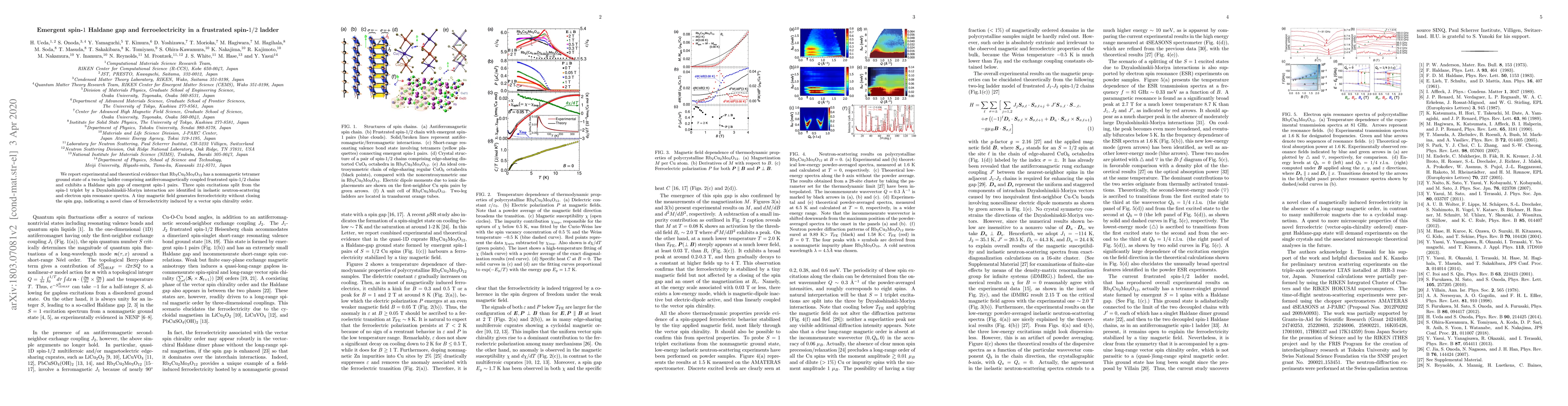 Rb$_2$Cu$_2$Mo$_3$O$_{12}$ exhibits a Haldane spin gap and emergent spin-1 pairs in a frustrated spin-$1/2$ ladder, accompanied by ferroelectricity induced by vector spin chirality without closing the spin gap. Experimental and theoretical evidence supports these findings through neutron-scattering and electron spin resonance techniques.