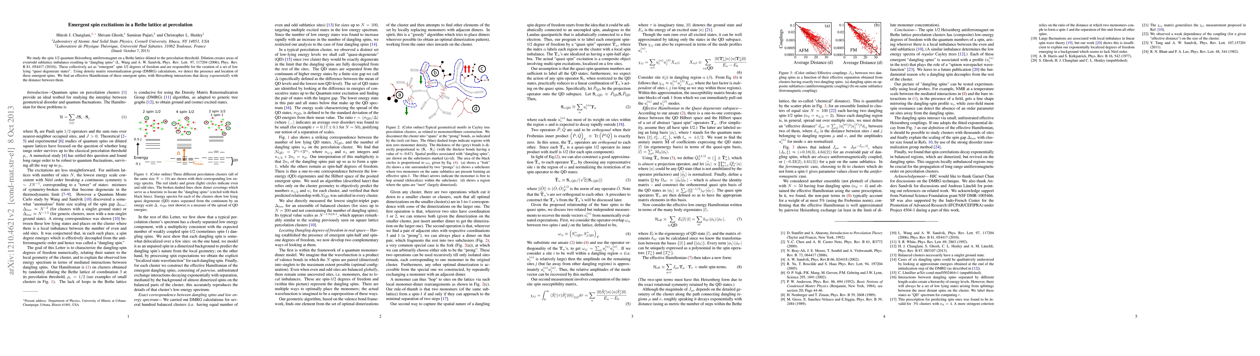 We study the spin 1/2 quantum Heisenberg antiferromagnet on a Bethe lattice diluted to the percolation threshold. Dilution creates areas of even/odd sublattice imbalance resulting in "dangling spins" (L. Wang and A. W. Sandvik, Phys. Rev. Lett. 97, 117204 (2006); Phys. Rev. B 81, 054417 (2010)). These collectively act as "emergent" spin 1/2 degrees of freedom and are responsible for the creation of a set of low lying "quasidegenerate states". Using Density Matrix Renormalization Group (DMRG) calculations, we detect the presence and location of these emergent spins. We find an effective Hamiltonian of these emergent spins, with Heisenberg interactions that decay exponentially with the distance between them.