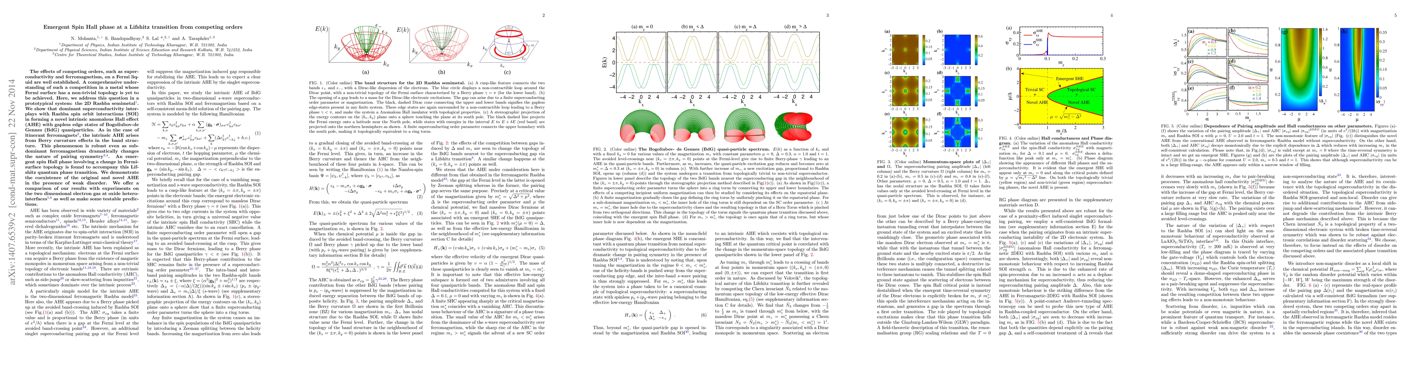 The effects of competing orders, such as superconductivity and ferromagnetism, on a Fermi liquid are well established. A comprehensive understanding of such a competition in a metal whose Fermi surface has a non-trivial topology is yet to be achieved. Here, we address this question in a prototypical system: the 2D Rashba semimetal. We show that dominant superconductivity interplays with Rashba spin orbit interactions (SOI) in forming a novel intrinsic anomalous Hall effect (AHE) with gapless edge states of Bogoliubov-de Gennes (BdG) quasiparticles. As in the case of itinerant ferromagnets, the intrinsic AHE arises from Berry curvature effects in the band structure. This phenomenon is robust even as sub-dominant ferromagnetism dramatically changes the nature of pairing symmetry. An emergent spin Hall phase involving a change in Fermi-surface topology is found to accompany this Lifshitz quantum phase transition. We demonstrate the coexistence of the original and novel AHE in the presence of weak disorder. We offer a comparison of our results with experiments on the two dimensional electron gas at oxide hetero-interfaces as well as make some testable predictions.