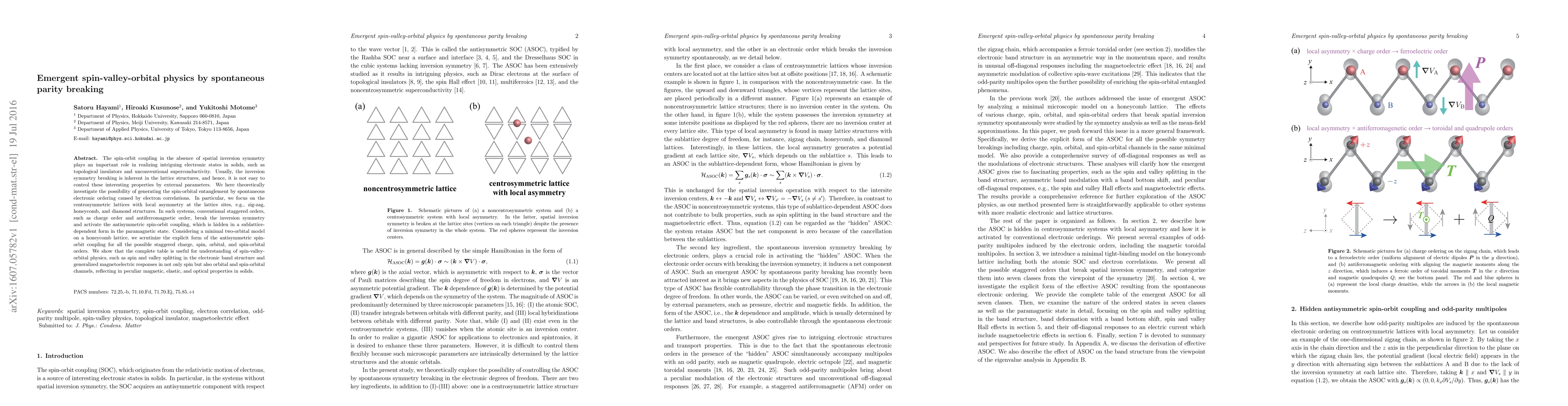 The spin-orbit coupling in the absence of spatial inversion symmetry plays an important role in realizing intriguing electronic states in solids, such as topological insulators and unconventional superconductivity. Usually, the inversion symmetry breaking is inherent in the lattice structures, and hence, it is not easy to control these interesting properties by external parameters. We here theoretically investigate the possibility of generating the spin-orbital entanglement by spontaneous electronic ordering caused by electron correlations. In particular, we focus on the centrosymmetric lattices with local asymmetry at the lattice sites, e.g., zig-zag, honeycomb, and diamond structures. In such systems, conventional staggered orders, such as charge order and antiferromagnetic order, break the inversion symmetry and activate the antisymmetric spin-orbit coupling, which is hidden in a sublattice-dependent form in the paramagnetic state. Considering a minimal two-orbital model on a honeycomb lattice, we scrutinize the explicit form of the antisymmetric spin-orbit coupling for all the possible staggered charge, spin, orbital, and spin-orbital orders. We show that the complete table is useful for understanding of spin-valley-orbital physics, such as spin and valley splitting in the electronic band structure and generalized magnetoelectric responses in not only spin but also orbital and spin-orbital channels, reflecting in peculiar magnetic, elastic, and optical properties in solids.