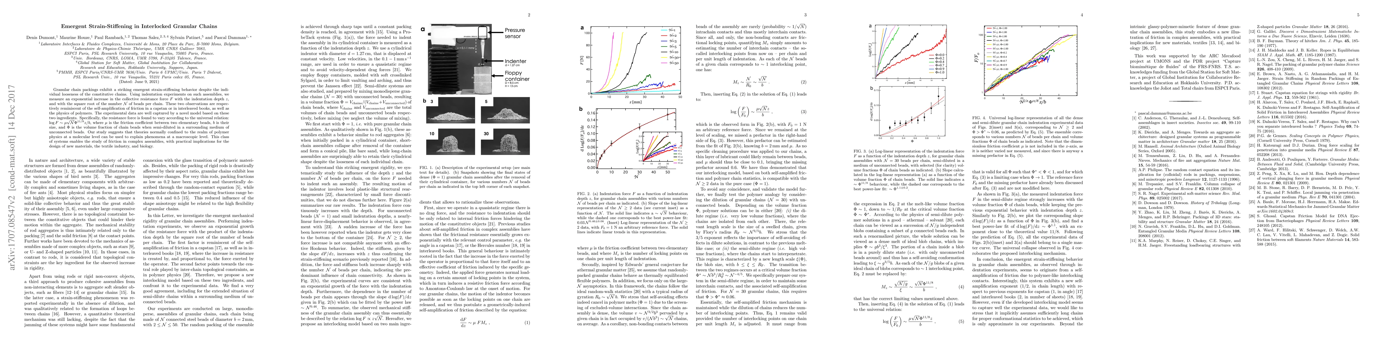 This paper investigates the emergent strain-stiffening behavior in interlocked granular chains, revealing an exponential increase in resistance force with indentation depth and the number of beads per chain. The findings are explained by a novel model, suggesting that polymer physics theories can elucidate macroscopic phenomena in granular systems.
