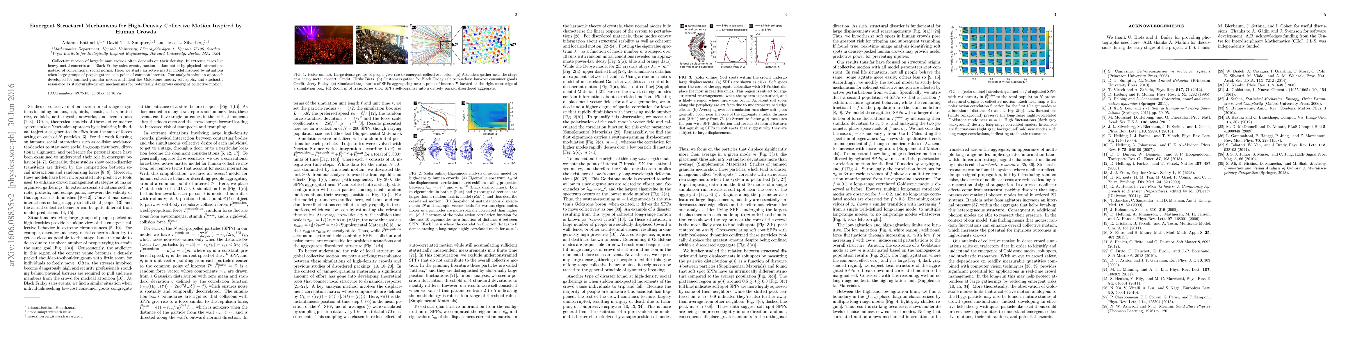 The study uses an active matter model inspired by large human crowds gathering at a common interest point. It employs an approach from jammed granular media to identify Goldstone modes, soft spots, and stochastic resonance as structural mechanisms for emergent collective motion. The model incorporates two populations of self-propelled particles (SPPs), with a fraction exhibiting more agitated behavior, to simulate behavioral diversity.