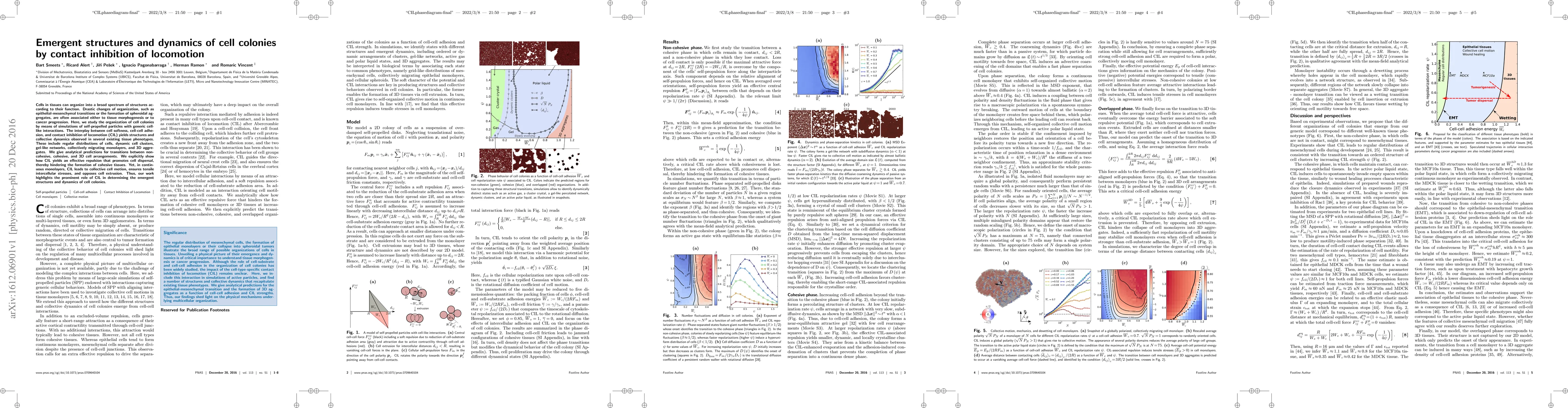 This research uses simulations of self-propelled particles to study how cell-cell interactions, especially contact inhibition of locomotion, shape the organization and dynamics of cell colonies, revealing diverse tissue structures and predicting transitions between different cell arrangements. Contact inhibition of locomotion promotes cell dispersal but supports collective motion in monolayers.