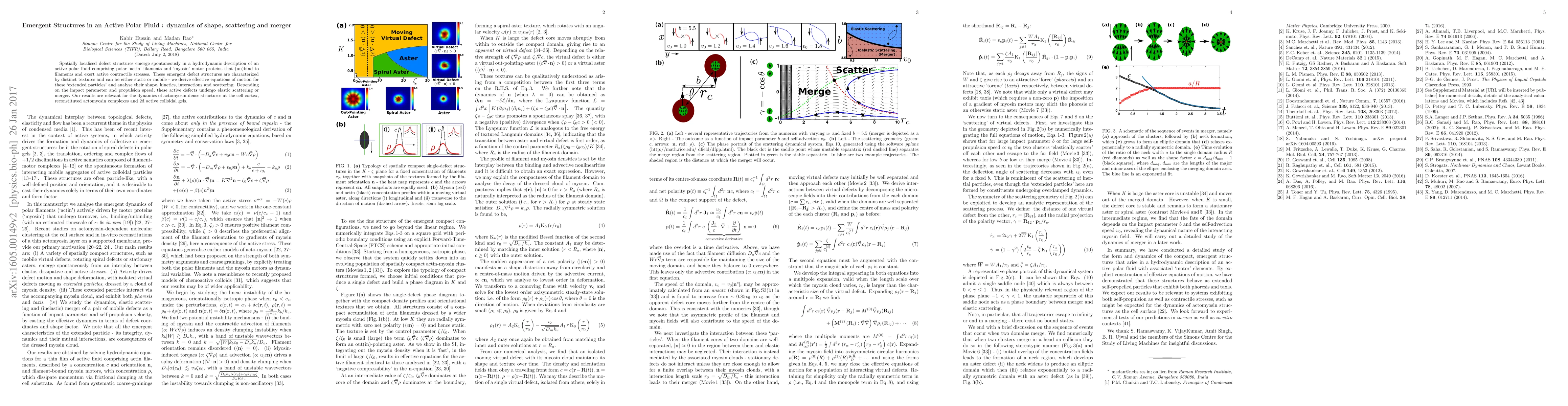 This paper investigates the spontaneous emergence of localized defect structures in active polar fluids composed of actin filaments and myosin motor proteins. The study derives effective equations of motion for these structures, analyzing their shape, kinetics, interactions, and scattering, revealing that they can either scatter elastically or merge depending on parameters like impact and speed.