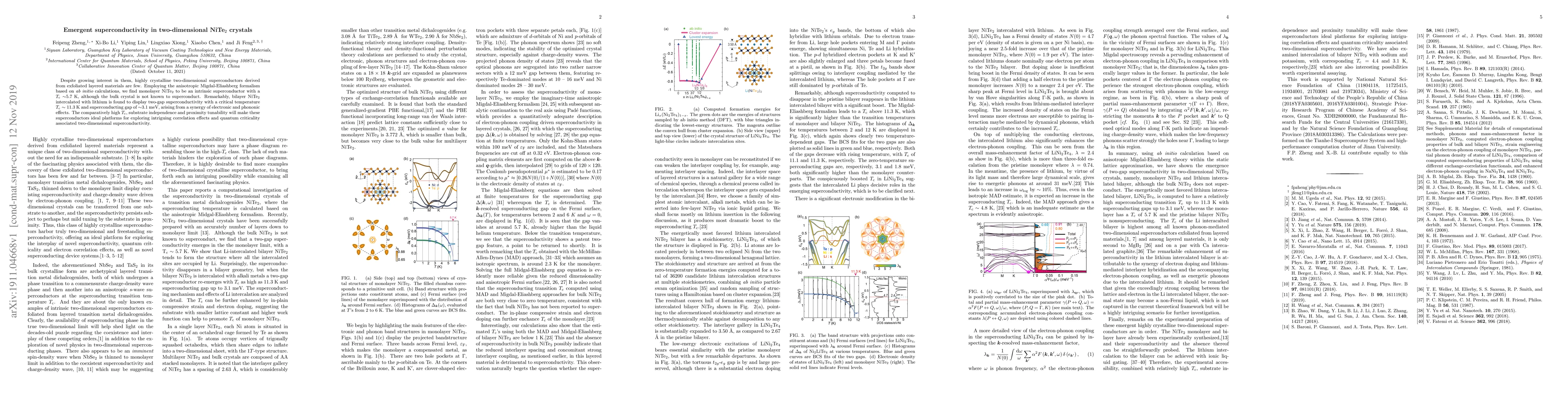 Despite growing interest in them, highly crystalline two-dimensional superconductors derived from exfoliated layered materials are few. Employing the anisotropic Migdal-Eliashberg formalism based on {\it ab initio} calculations, we find monolayer NiTe$_{2}$ to be an intrinsic superconductor with a $T_{\text c}\sim$5.7~K, although the bulk crystal is not known to superconduct. Remarkably, bilayer NiTe$_{2}$ intercalated with lithium is found to display two-gap superconductivity with a critical temperature $T_{\text{c}}\sim 11.3$~K and superconducting gap of $\sim$3.1~meV, arising from a synergy of electronic and phononic effects. The comparatively high $T_\text{c}$, substrate independence and proximity tunability will make these superconductors ideal platforms for exploring intriguing correlation effects and quantum criticality associated two-dimensional superconductivity.