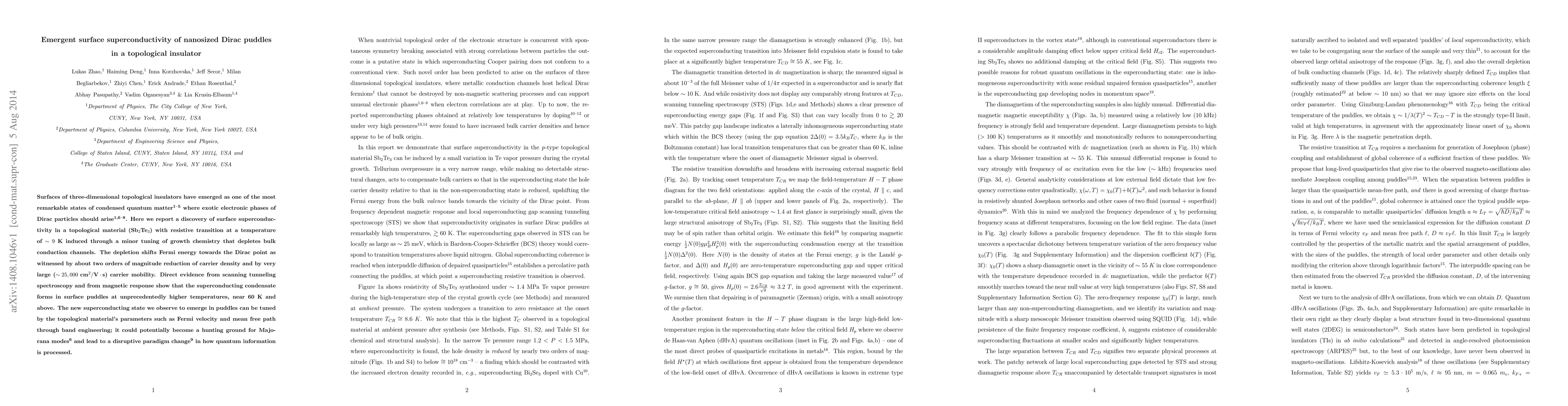 Surfaces of three-dimensional topological insulators have emerged as one of the most remarkable states of condensed quantum matter1-5 where exotic electronic phases of Dirac particles should arise1,6-8. Here we report a discovery of surface superconductivity in a topological material (Sb2Te3) with resistive transition at a temperature of ~9 K induced through a minor tuning of growth chemistry that depletes bulk conduction channels. The depletion shifts Fermi energy towards the Dirac point as witnessed by about two orders of magnitude reduction of carrier density and by very large (~25,000 cm^2/Vs) carrier mobility. Direct evidence from scanning tunneling spectroscopy and from magnetic response show that the superconducting condensate forms in surface puddles at unprecedentedly higher temperatures, near 60 K and above. The new superconducting state we observe to emerge in puddles can be tuned by the topological material's parameters such as Fermi velocity and mean free path through band engineering; it could potentially become a hunting ground for Majorana modes6 and lead to a disruptive paradigm change9 in how quantum information is processed.