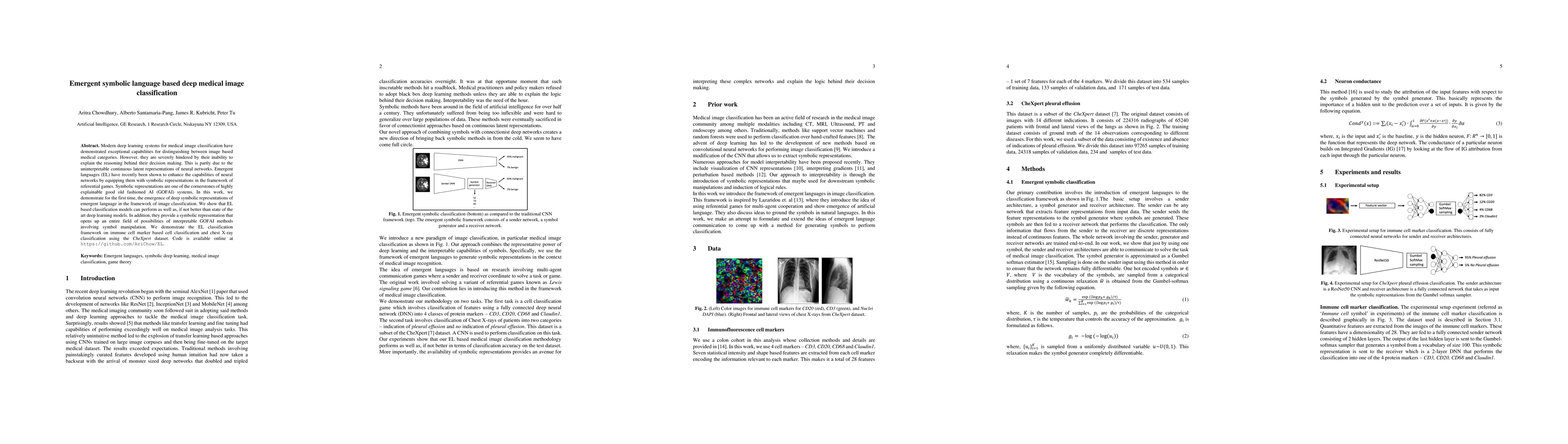 This paper explores the emergence of deep symbolic representations through emergent language in medical image classification, demonstrating that these models can match or exceed the performance of state-of-the-art deep learning models while offering more interpretable symbolic representations. The approach is showcased on immune cell marker and chest X-ray classification tasks.