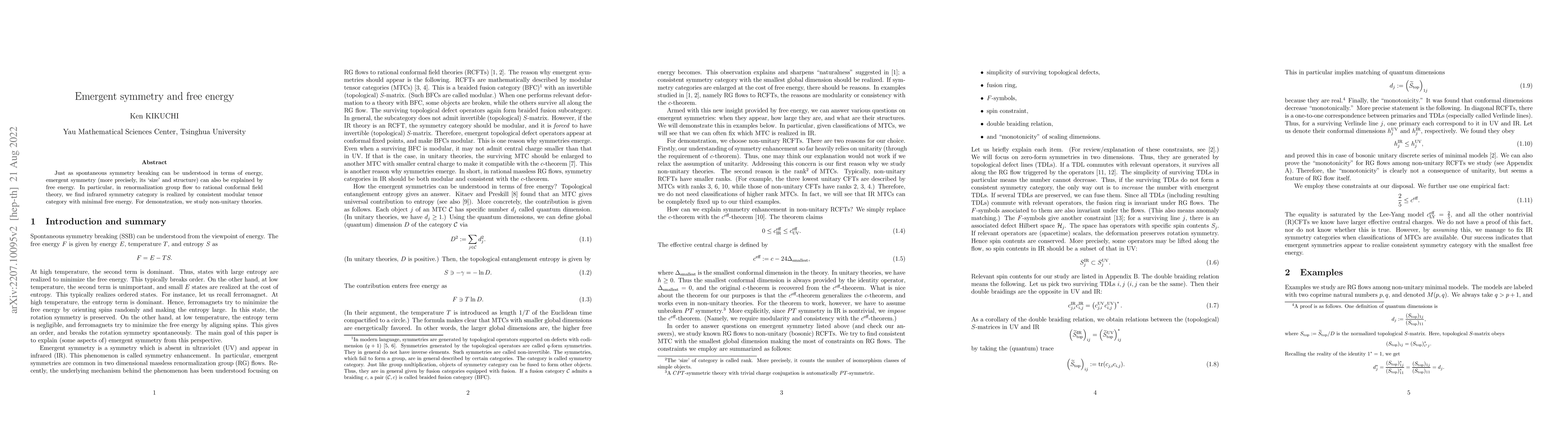 This paper explores how emergent symmetry can be understood through the lens of free energy, demonstrating that in renormalization group flows to rational conformal field theory, the infrared symmetry category is realized by a consistent modular tensor category with minimal free energy, particularly in non-unitary theories.