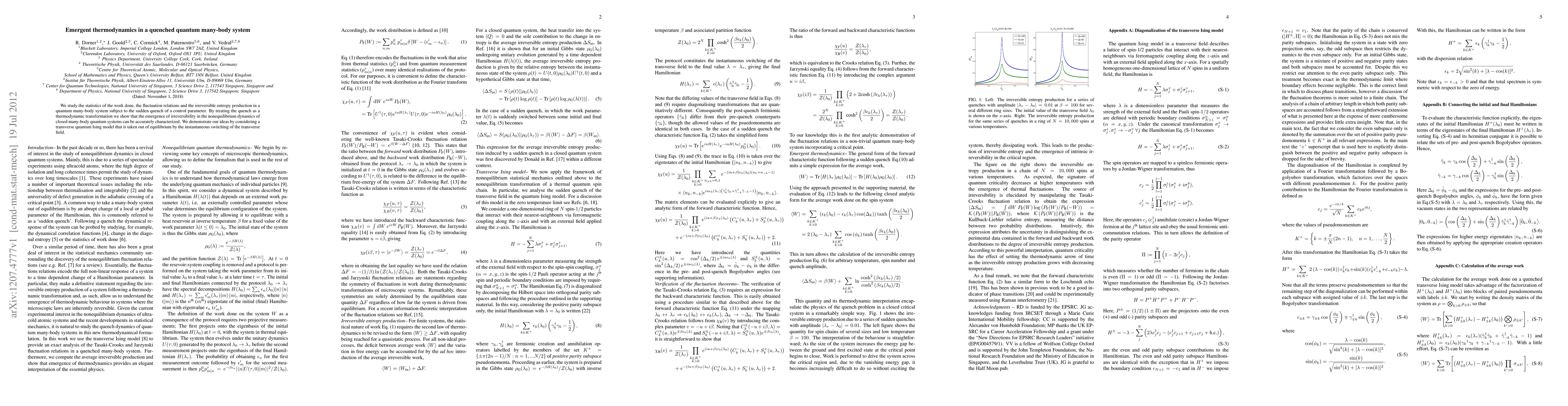 We study the statistics of the work done, the fluctuation relations and the irreversible entropy production in a quantum many-body system subject to the sudden quench of a control parameter. By treating the quench as a thermodynamic transformation we show that the emergence of irreversibility in the nonequilibrium dynamics of closed many-body quantum systems can be accurately characterized. We demonstrate our ideas by considering a transverse quantum Ising model that is taken out of equilibrium by the instantaneous switching of the transverse field.