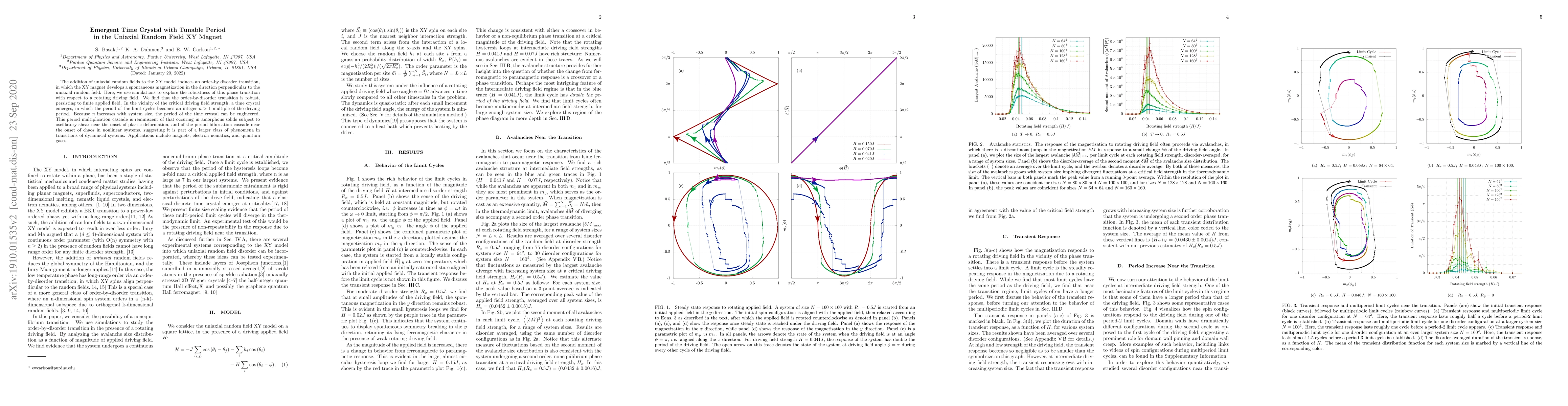 The study reveals that uniaxial random fields induce an order-by-disorder transition in the XY model, leading to spontaneous magnetization. Simulations show that a tunable time crystal emerges near the critical field strength, with its period engineered by system size, suggesting broader implications for dynamical systems.