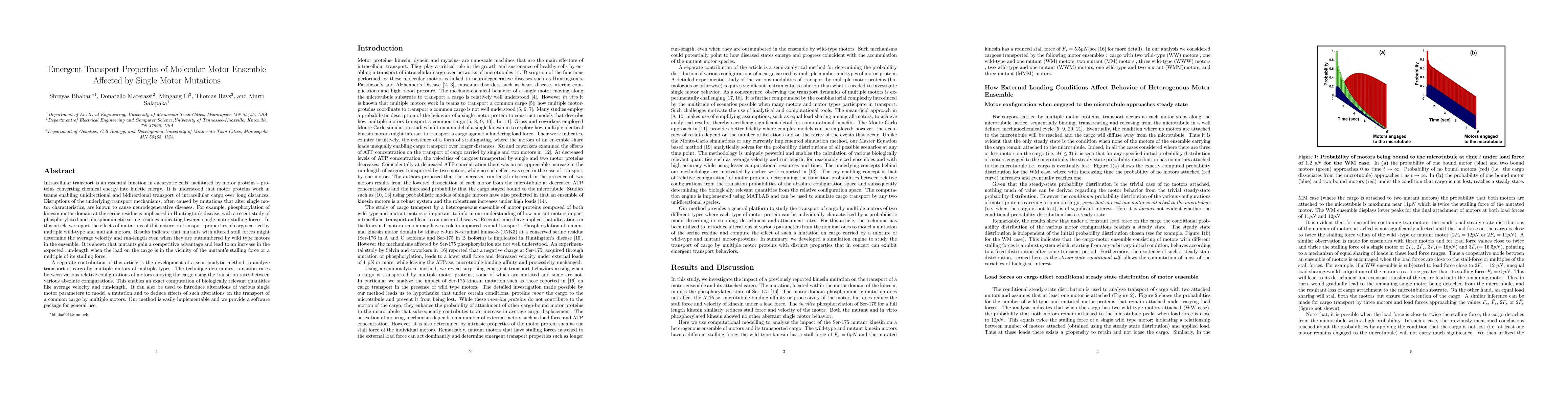 This paper investigates how single motor mutations affect the emergent transport properties of molecular motor ensembles, demonstrating that mutants with altered stall forces can influence the average velocity and run-length of cargo transport, even when outnumbered by wild-type motors. The authors also introduce a semi-analytic method to analyze cargo transport by multiple motor types, providing a software package for its implementation.