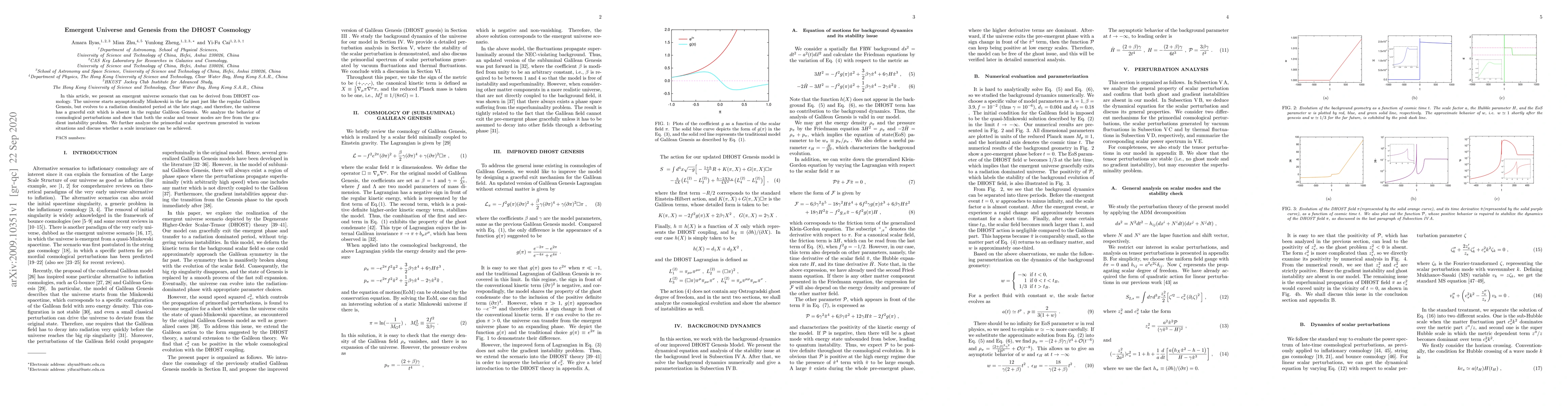 This paper explores an emergent universe scenario from DHOST cosmology, showing a transition from an asymptotically Minkowski past to a radiation-dominated late stage, with a graceful exit. The study also examines the stability of cosmological perturbations and the potential for scale invariance in the primordial scalar spectrum.