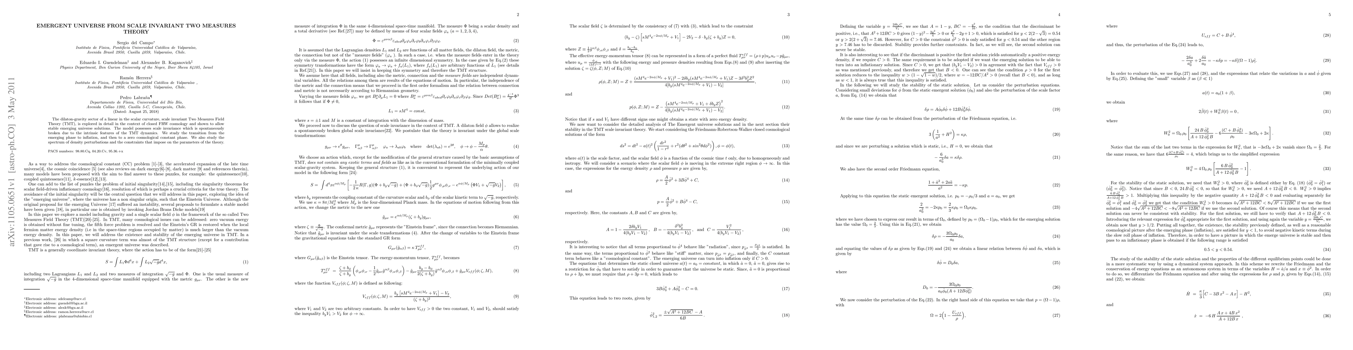 This paper explores a scale invariant Two Measures Field Theory (TMT) in the context of closed FRW cosmology, demonstrating its potential for stable emerging universe solutions. The model transitions from an emerging phase to inflation, and finally to a zero cosmological constant phase, while imposing constraints on its parameters through the spectrum of density perturbations.