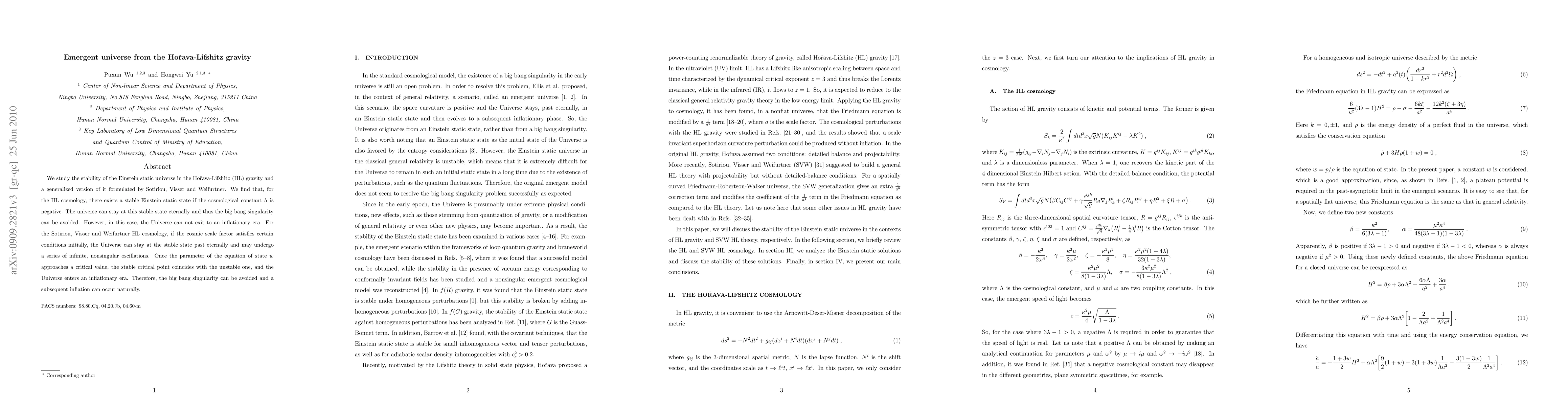This paper investigates the stability of the Einstein static universe in Ho\v{r}ava-Lifshitz (HL) gravity and a generalized version, finding that a stable state can avoid the big bang singularity but precludes inflation. In the generalized HL cosmology, a critical parameter value can trigger inflation and allow for nonsingular oscillations.