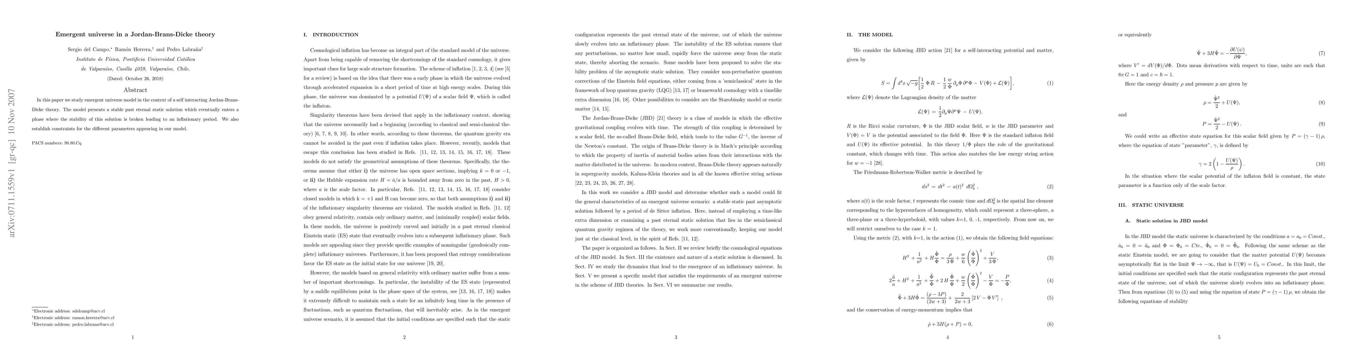 This paper explores an emergent universe model in the framework of self-interacting Jordan-Brans-Dicke theory, revealing a stable static solution that transitions into an inflationary phase, with constraints established for the model's parameters.
